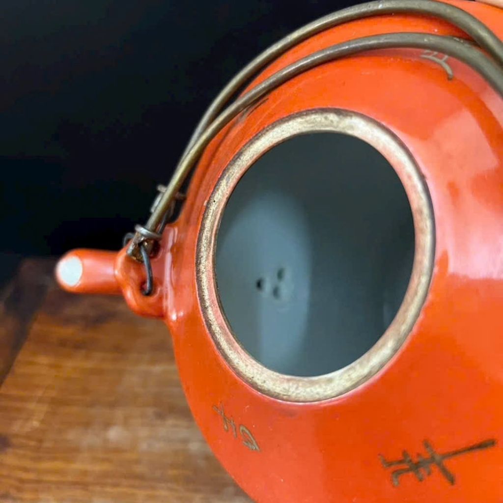 Chiếc ấm gây ấn tượng mạnh bởi sắc cam đỏ đặc trưng của gốm cổ, làm nền cho các họa tiết điển tích được vẽ vàng tinh xảo, từng đường nét sắc sảo, đều tay, toát lên vẻ quyền quý và sang trọng. Phần quai đồng tạo điểm nhấn thô mộc nhưng hài hòa, phản ánh kỹ thuật chế tác thủ công bậc thầy của nghệ nhân xưa.