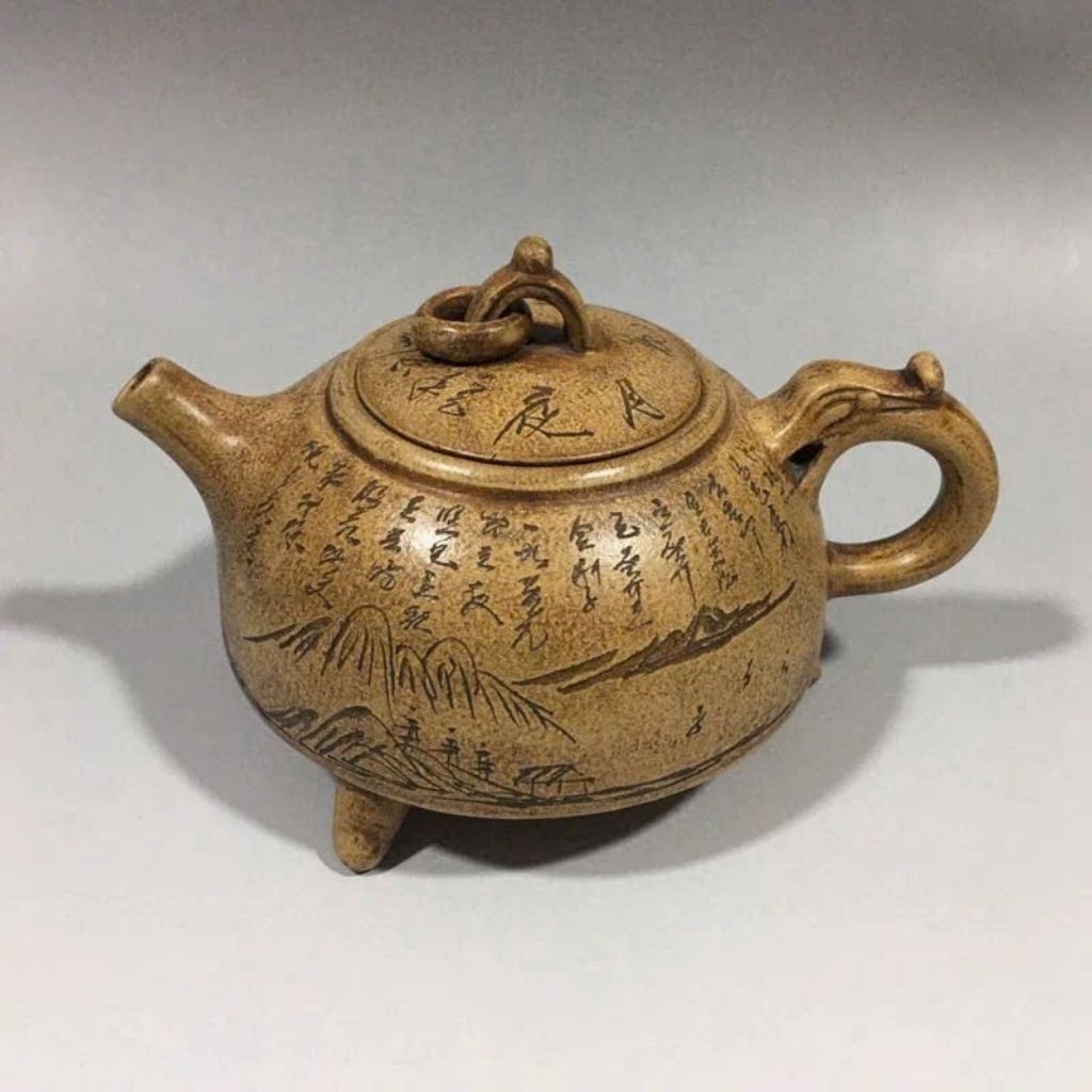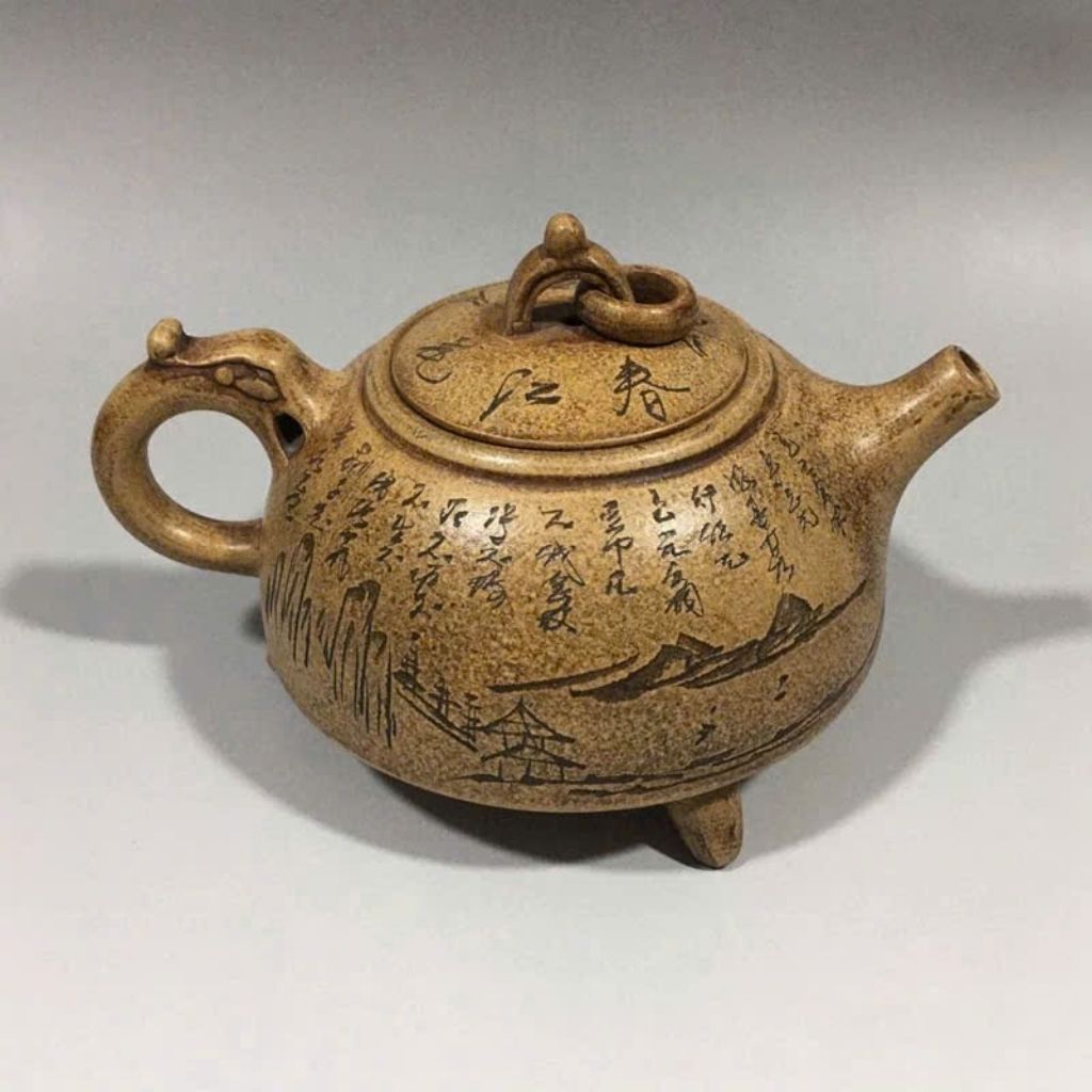 Thân ấm và nắp ấm chạm khắc thư pháp Hán tự cổ kết hợp tranh sơn thủy hữu tình