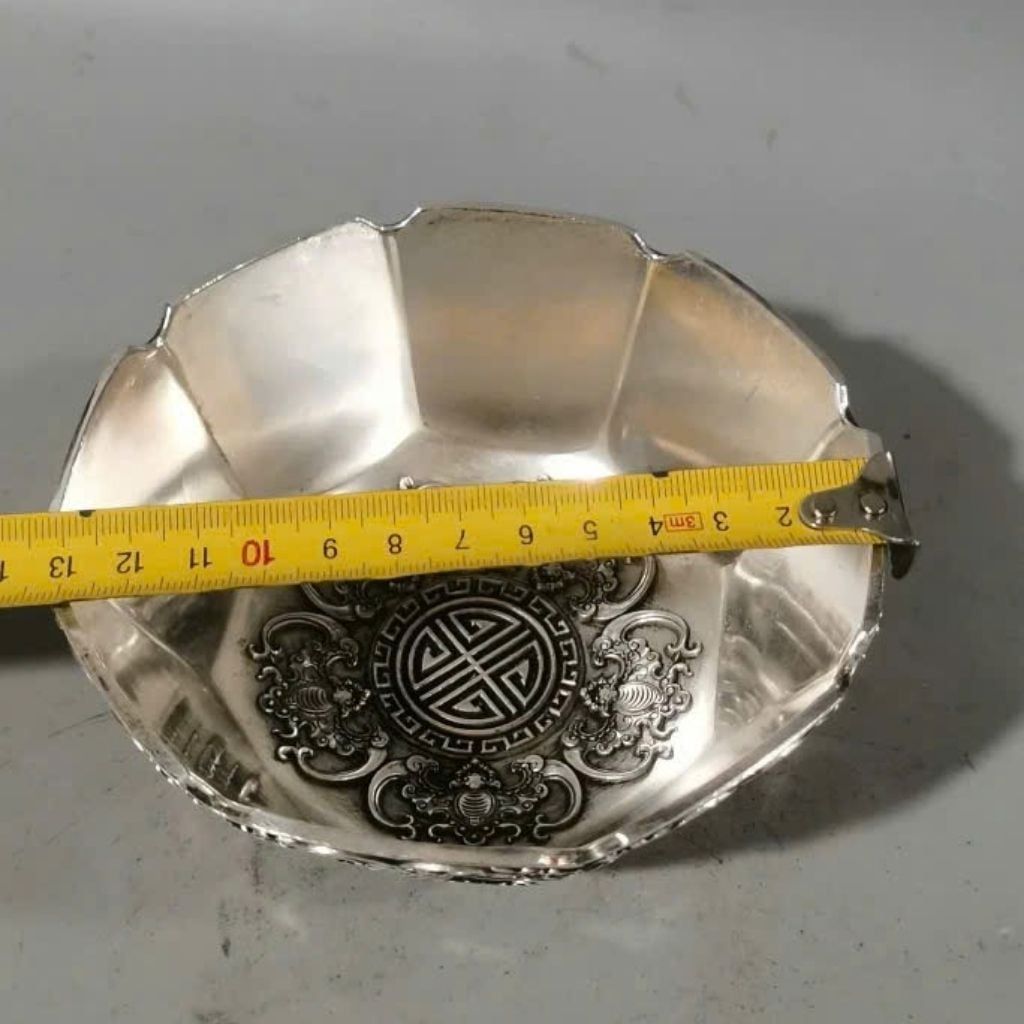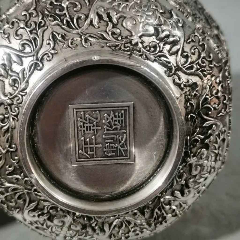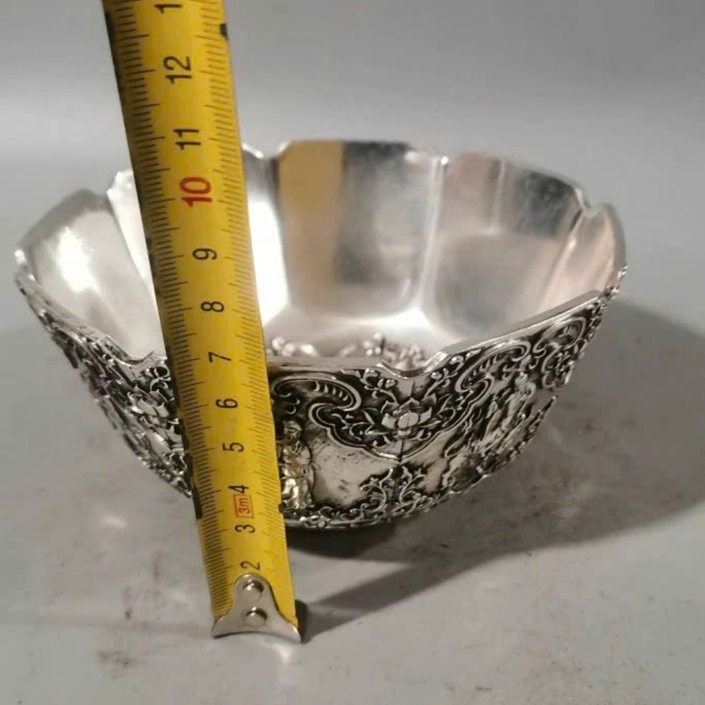 Sản phẩm gây ấn tượng bởi sắc bạc sáng nổi bật trên nền đồng chắc chắn, từng đường chạm nổi rõ nét, thể hiện chiều sâu và sự tinh tế trong từng chi tiết nhỏ. Tổng thể vừa cổ kính vừa sang trọng, dễ tạo điểm nhấn cho không gian trưng bày.