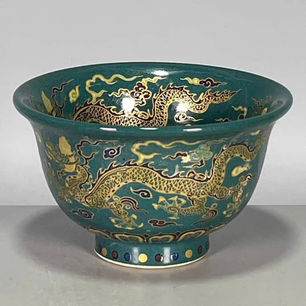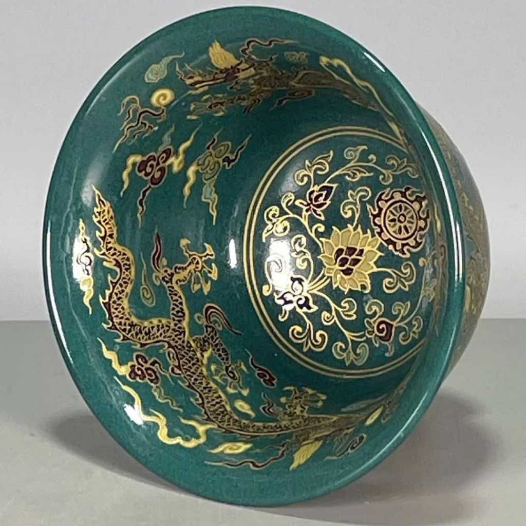 Chiếc bát gây ấn tượng mạnh ngay từ ánh nhìn đầu tiên với nền men xanh lục bảo sâu và trầm, tạo cảm giác cổ kính và sang trọng. Trên nền men ấy là hình ảnh rồng oai nghiêm uốn lượn giữa mây ngũ sắc, từng nét vẽ mềm mại nhưng đầy khí lực, thể hiện trình độ thủ công bậc thầy của nghệ nhân.