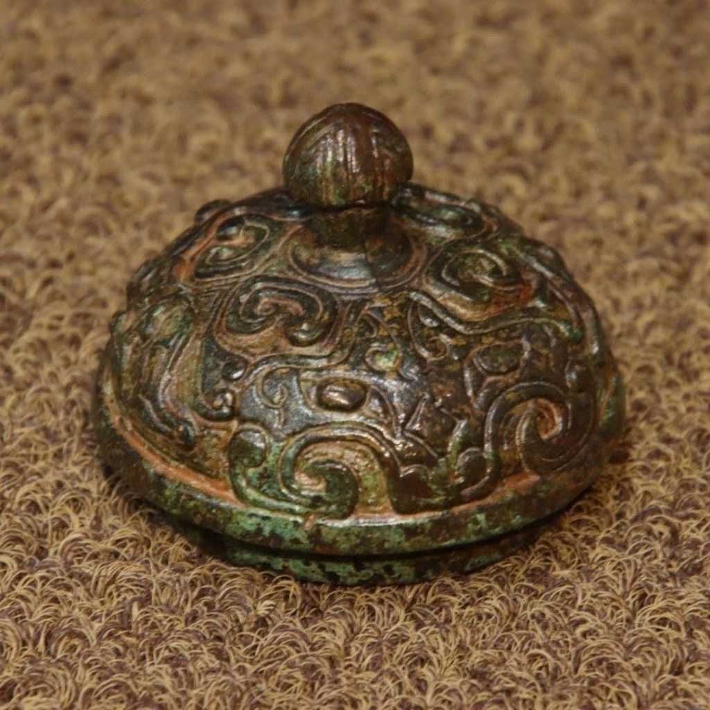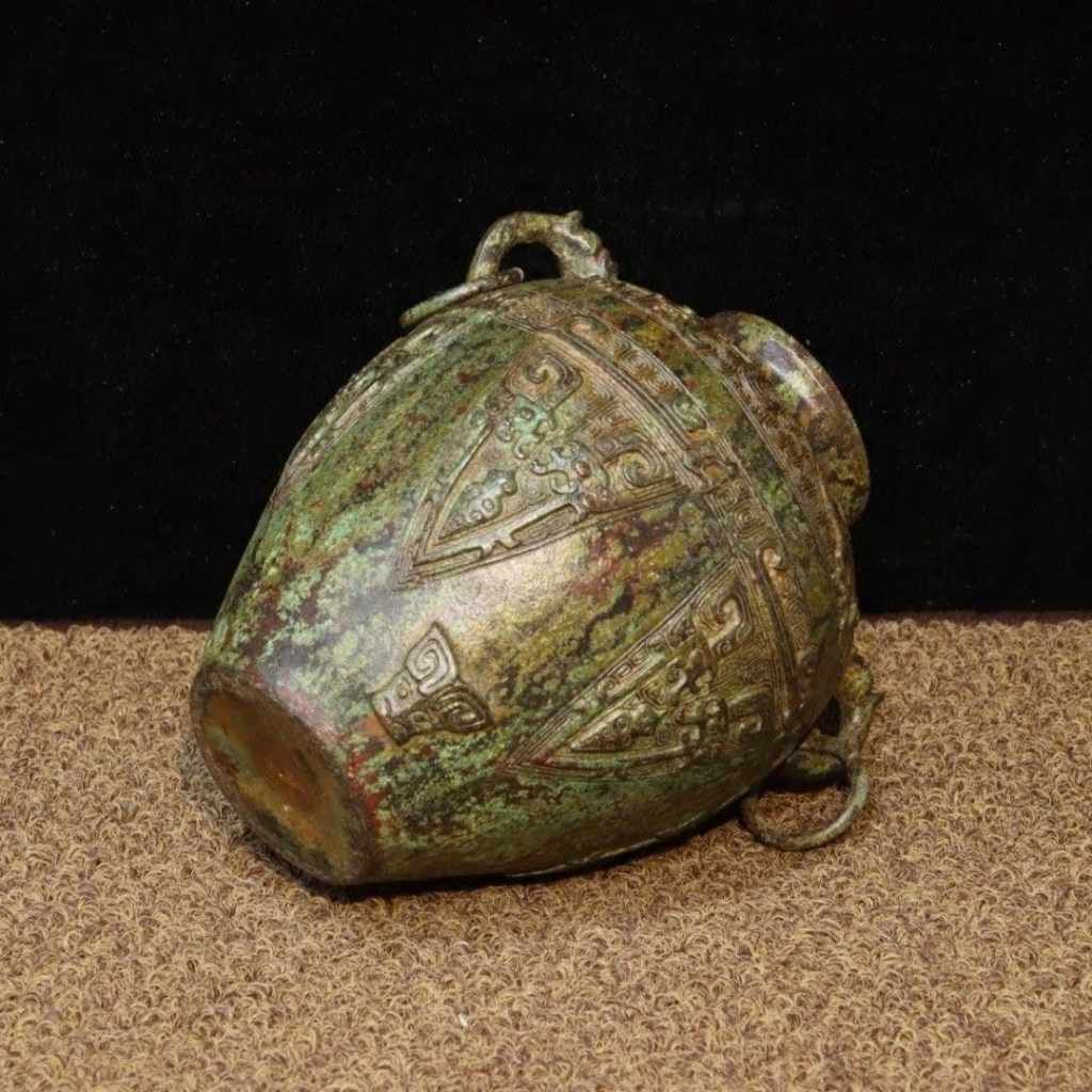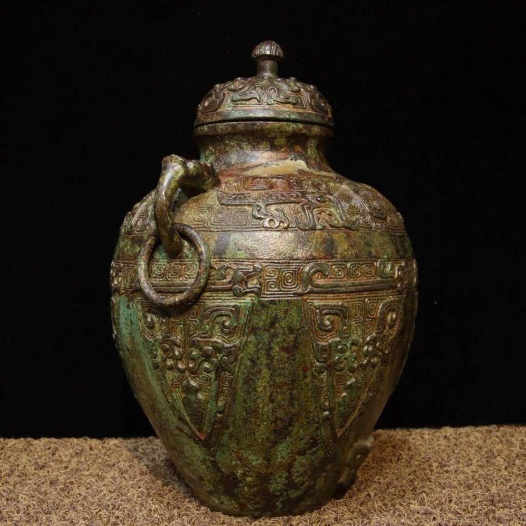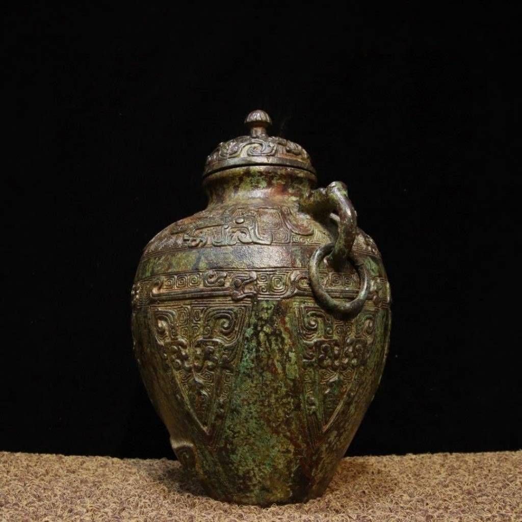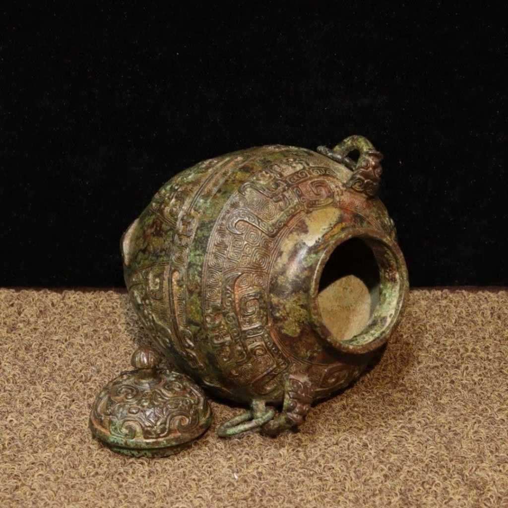 Chiếc bình gây ấn tượng mạnh bởi dáng bầu vững chãi kết hợp cùng hai quai linh vật mềm mại nhưng đầy uy lực. Toàn bộ thân và nắp được phủ kín các lớp phù điêu cổ, tạo chiều sâu thị giác và cảm giác bề thế. Lớp patina xanh rêu tự nhiên nhuốm màu thời gian chính là minh chứng rõ nét cho giá trị sưu tầm lâu năm của tác phẩm.