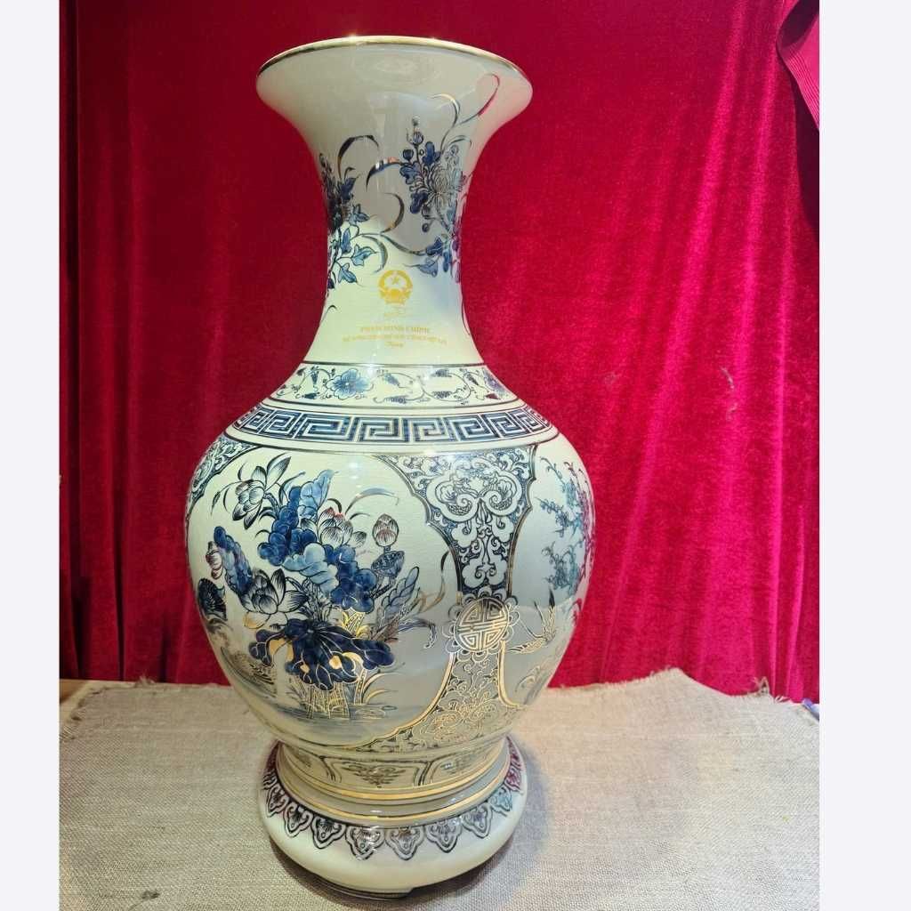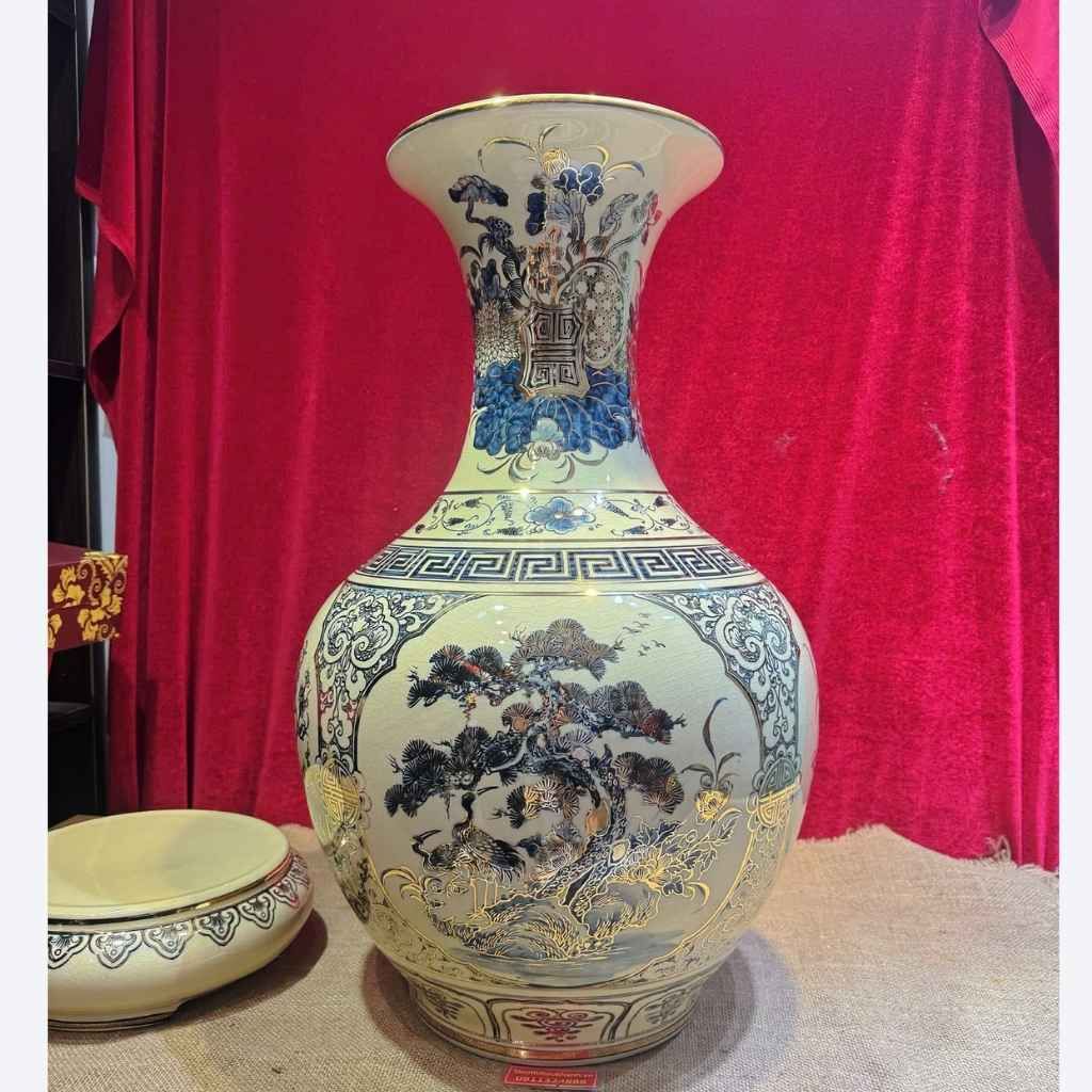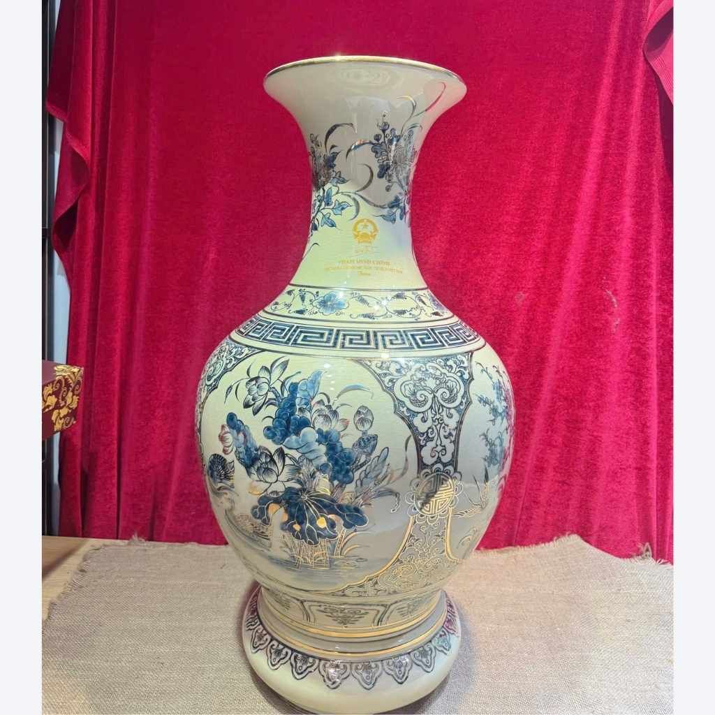 Sản phẩm nổi bật với bố cục cân đối, họa tiết được xử lý tinh tế trên nền men kem sang trọng. Dáng bình viên mãn giúp thu hút và giữ gìn sinh khí, tạo cảm giác đầy đặn, bền vững và trang trọng khi trưng bày.