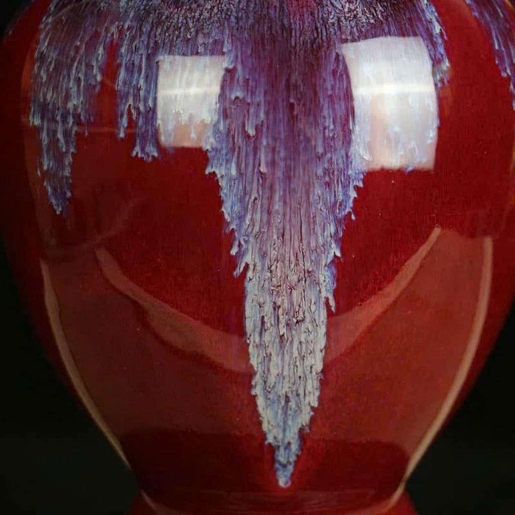 Bình gây ấn tượng bởi dáng vẻ thanh thoát nhưng bề thế, kết hợp hài hòa giữa hình khối cổ điển và chi tiết tai lân mạnh mẽ. Đặc biệt, nước men đỏ huyết dụ sâu thẳm được điểm xuyết bởi các dải men hỏa biến tím – trắng chảy tự nhiên từ cổ xuống thân bình, tạo nên hiệu ứng như dòng thác ánh sáng, khiến mỗi sản phẩm đều mang vẻ đẹp riêng, không trùng lặp.