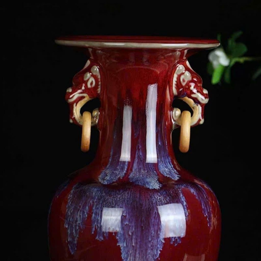 Bình Gốm Men Đỏ Huyết Dụ Tai Lân Cổ Điển – Vẻ Đẹp Hỏa Biến Huyền Bí, Sang Trọng & Quyền Uy