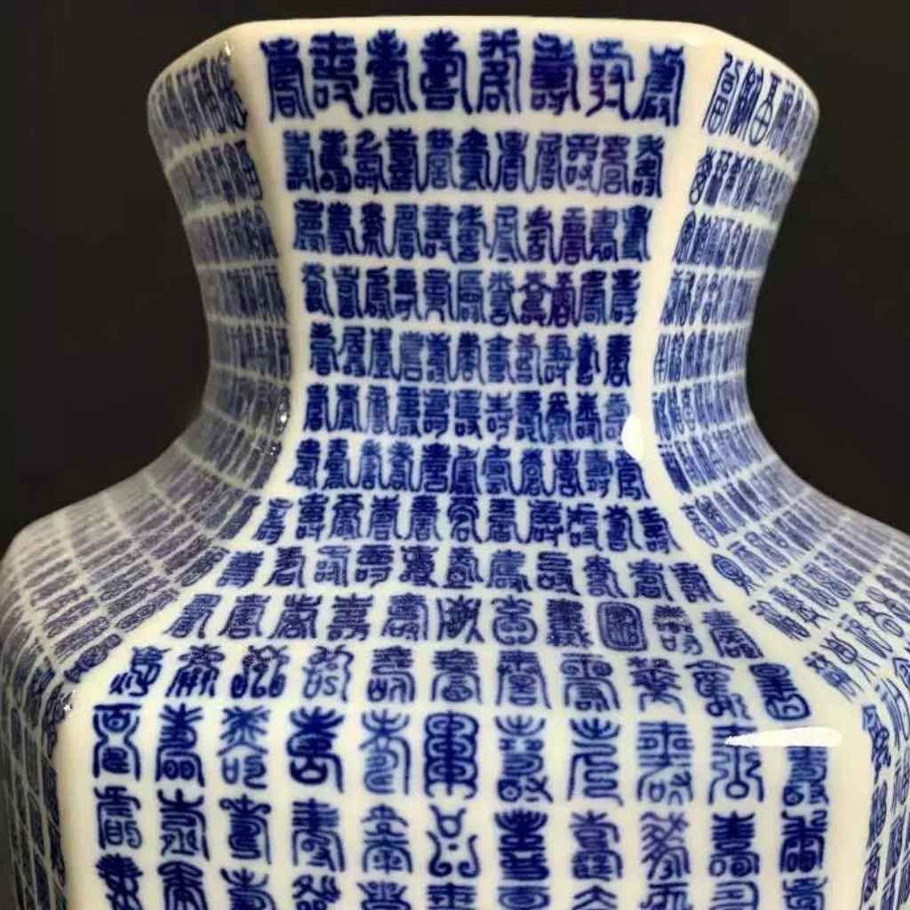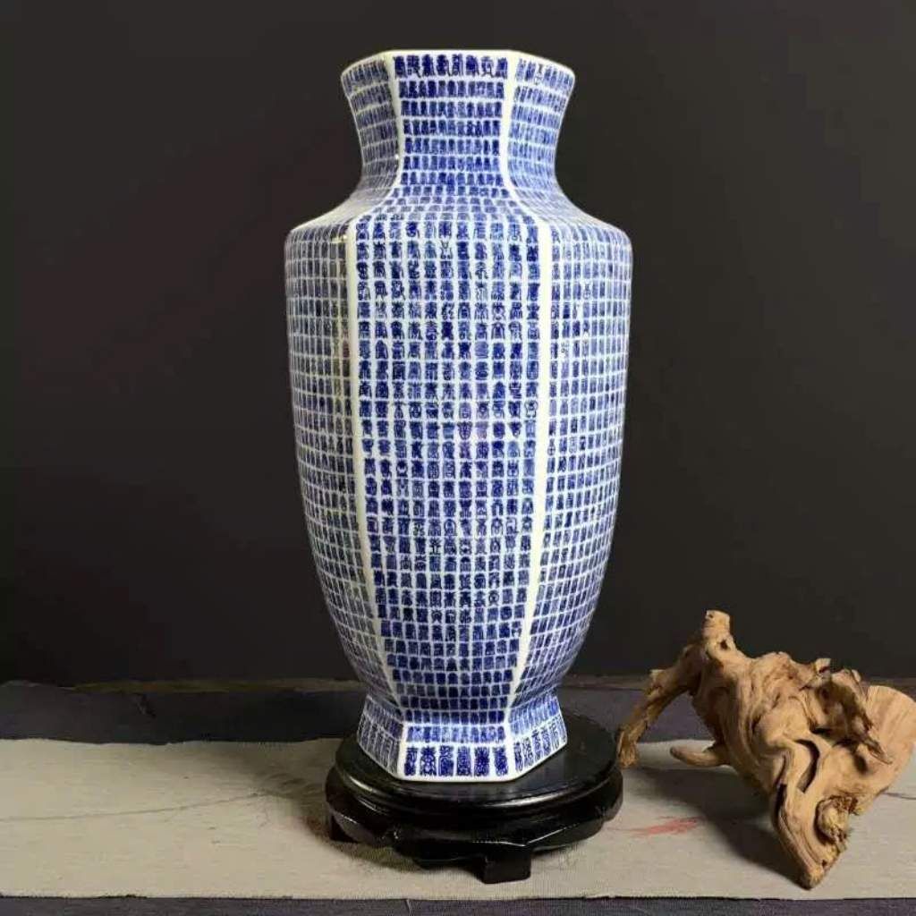 Toàn bộ thân bình được phủ dày đặc các dòng chữ Hán / kinh văn Phật giáo màu xanh cobalt đặc trưng, tạo chiều sâu thị giác và cảm giác trang nghiêm. Các nét chữ đều đặn, rõ ràng, thể hiện tay nghề cao của nghệ nhân gốm sứ.