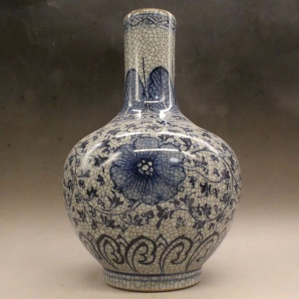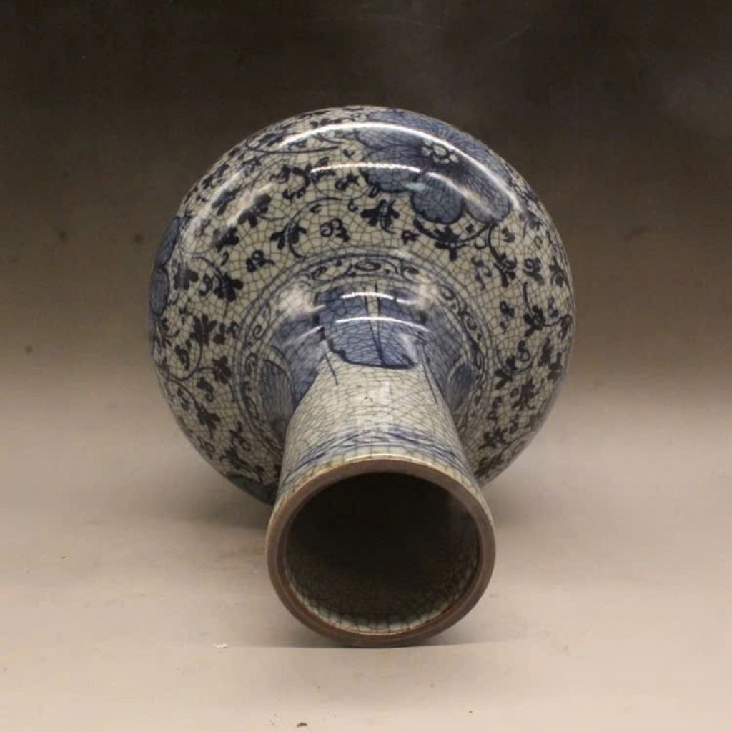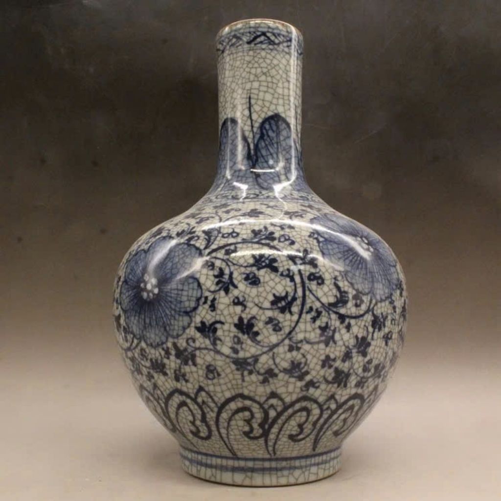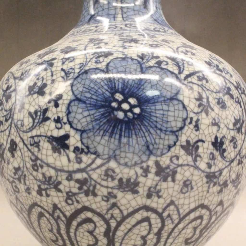 Chiếc bình gây ấn tượng bởi những đường men rạn tự nhiên tinh tế, tạo chiều sâu thị giác và cảm giác hoài cổ đặc trưng. Sự kết hợp giữa men rạn và họa tiết mẫu đơn xanh lam giúp tổng thể trở nên thanh lịch nhưng vẫn vô cùng nổi bật.