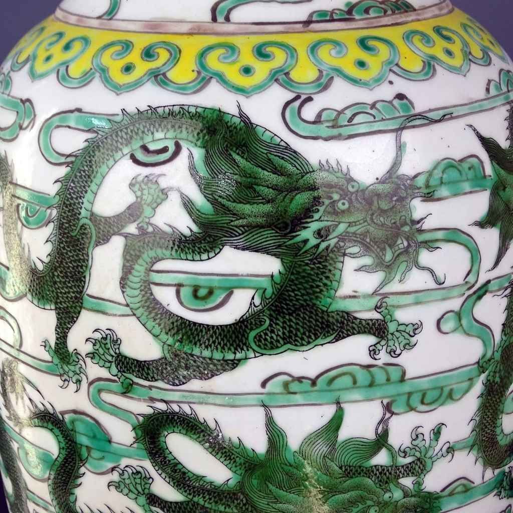 Họa tiết rồng được vẽ tay tỉ mỉ, thần thái dũng mãnh, vảy rồng sắc nét – biểu trưng cho sức mạnh tối thượng và sự bảo hộ bền vững. Sự phối hợp màu sắc hài hòa giữa xanh lục – trắng – vàng – lam mang lại tổng thể rực rỡ nhưng vẫn thanh tao, đúng chuẩn một tác phẩm gốm sứ sưu tầm giá trị.