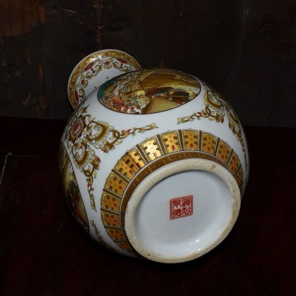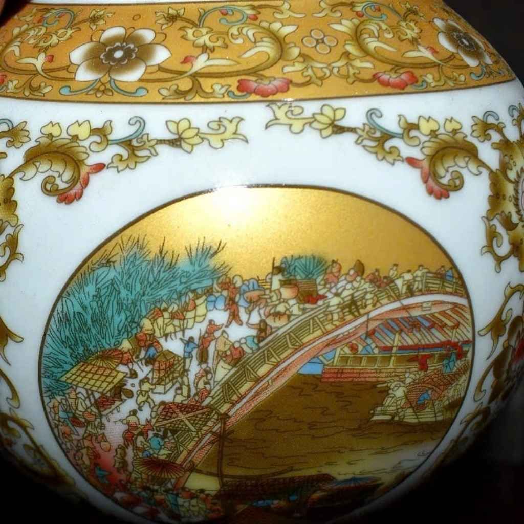 Điểm nhấn trung tâm là khung tranh Thanh Minh Thượng Hà Đồ được vẽ tay tỉ mỉ trong ô tròn viền vàng kim sang trọng. Từng chi tiết về con người, xe ngựa, kiến trúc cổ đều sắc nét, giàu chiều sâu. Bao quanh là hệ hoa văn phong cách hoàng gia, kết hợp triện cổ và hoa lá cách điệu, tạo nên tổng thể hài hòa giữa nghệ thuật gốm sứ và hội họa kinh điển. Lớp men bóng mịn giúp bảo vệ họa tiết nhũ vàng, giữ cho bình luôn bền đẹp theo thời gian.