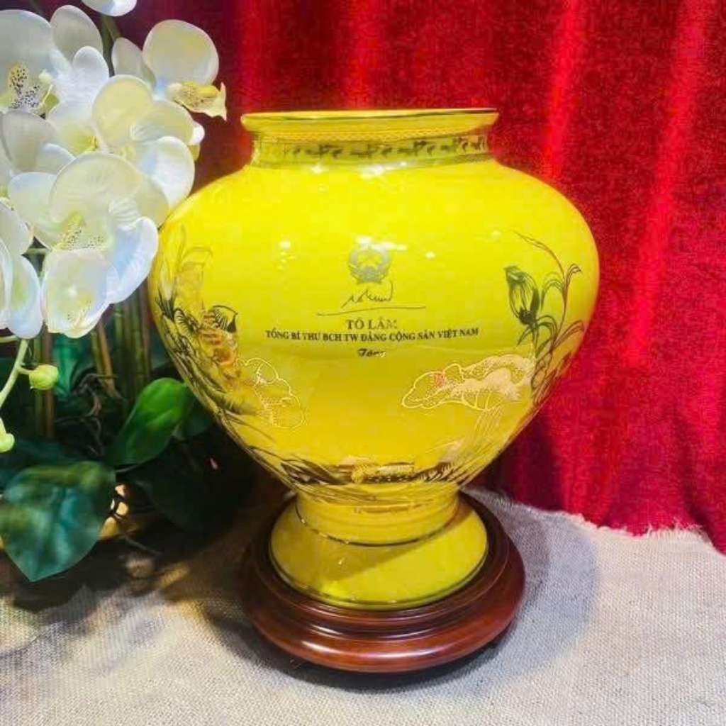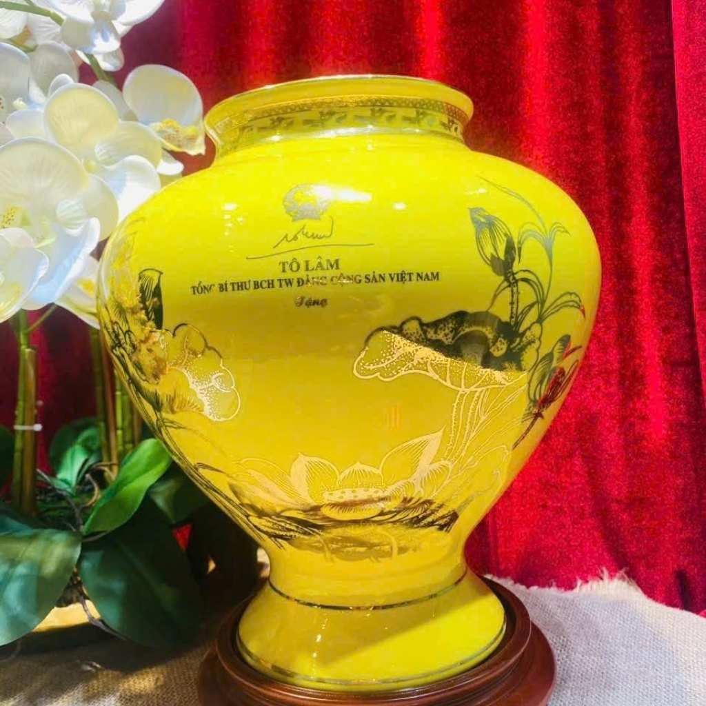 Bình Hút Lộc Gốm Sứ Bát Tràng Màu Vàng In Hình Tổng Bí Thư Tô Lâm – Trang Trọng, Ý Nghĩa, Giá Trị Trưng Bày Cao