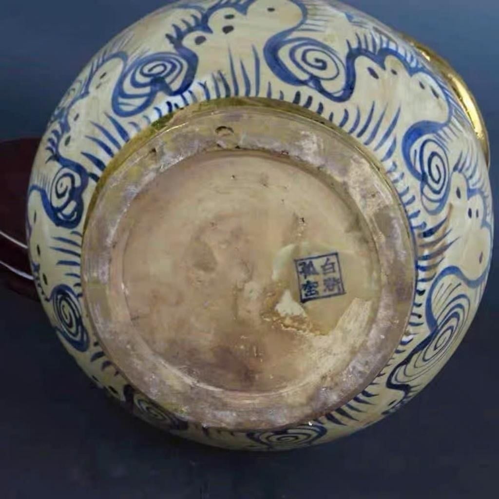 Thiết kế: Dáng bầu tròn đầy đặn, miệng loe viền vàng, hai quai tai tạo hình đầu rồng mạ vàng uy nghi