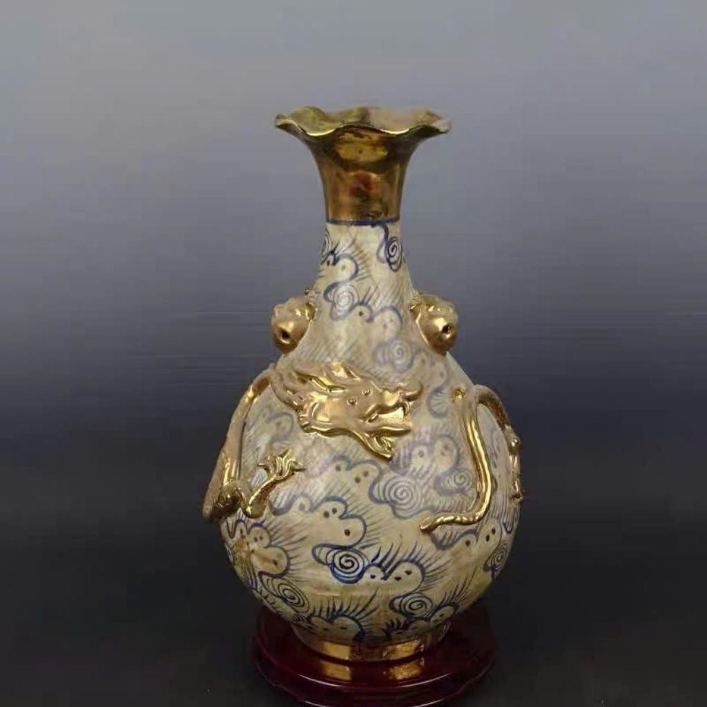 Họa tiết: Mây nước cách điệu phủ thân bình, nổi bật là rồng đắp nổi 3D uốn lượn mạnh mẽ với chi tiết vảy, đầu và móng sắc nét