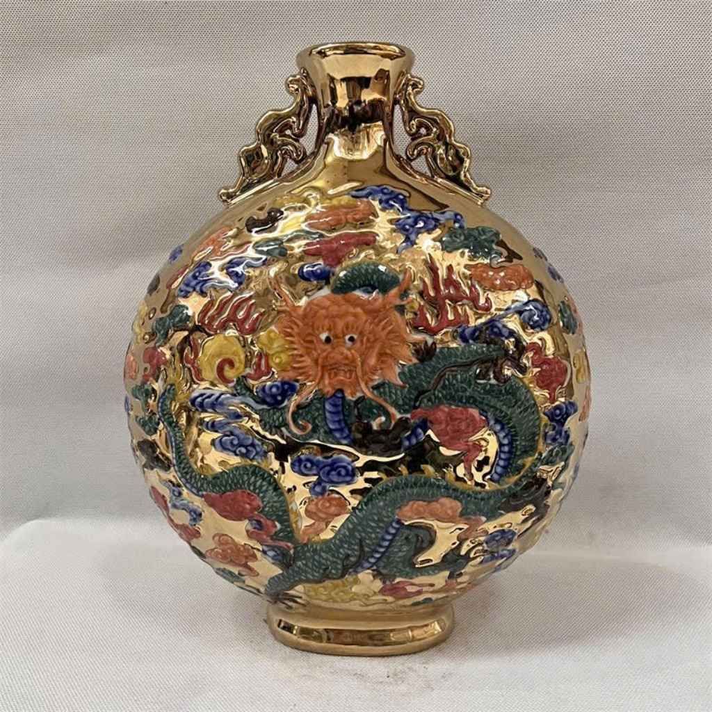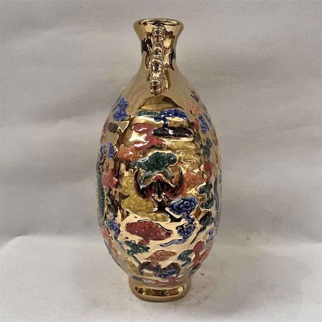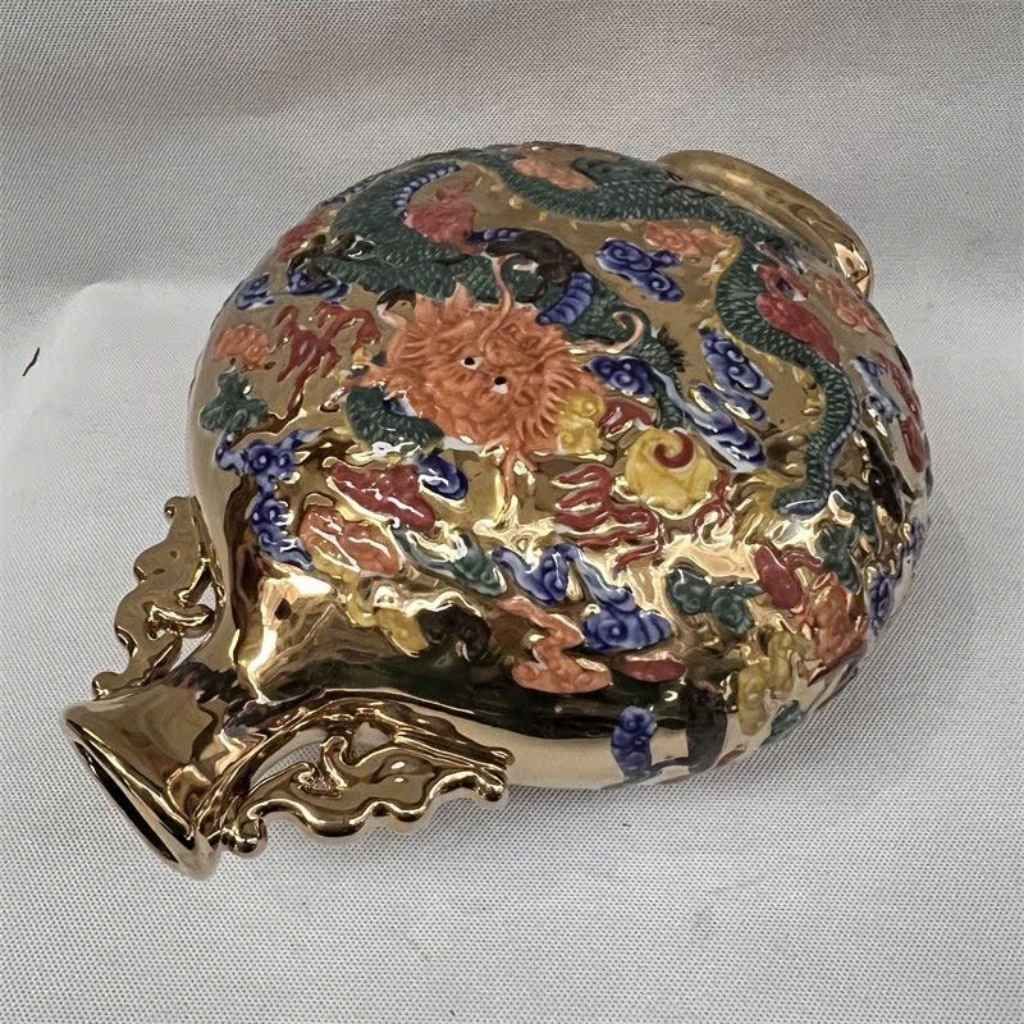 Toàn bộ bề mặt bình được tráng vàng sáng loáng, tạo lớp nền rực rỡ làm nổi bật họa tiết rồng đắp nổi với thần thái oai nghiêm. Vảy rồng, mây ngũ sắc được phối men tinh tế, tạo chiều sâu thị giác và cảm giác sống động. Hai bên cổ bình là đôi tai uốn cong cách điệu, tăng vẻ thanh thoát nhưng vẫn giữ nét uy nghi cho tác phẩm sưu tầm.