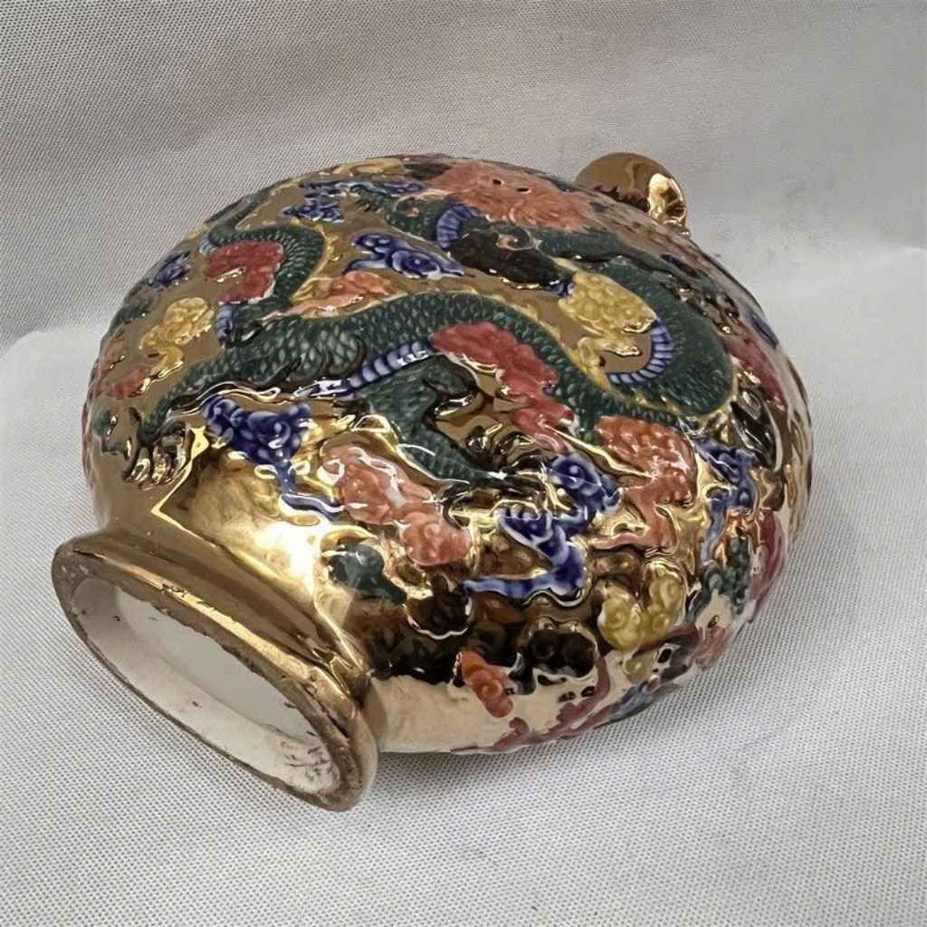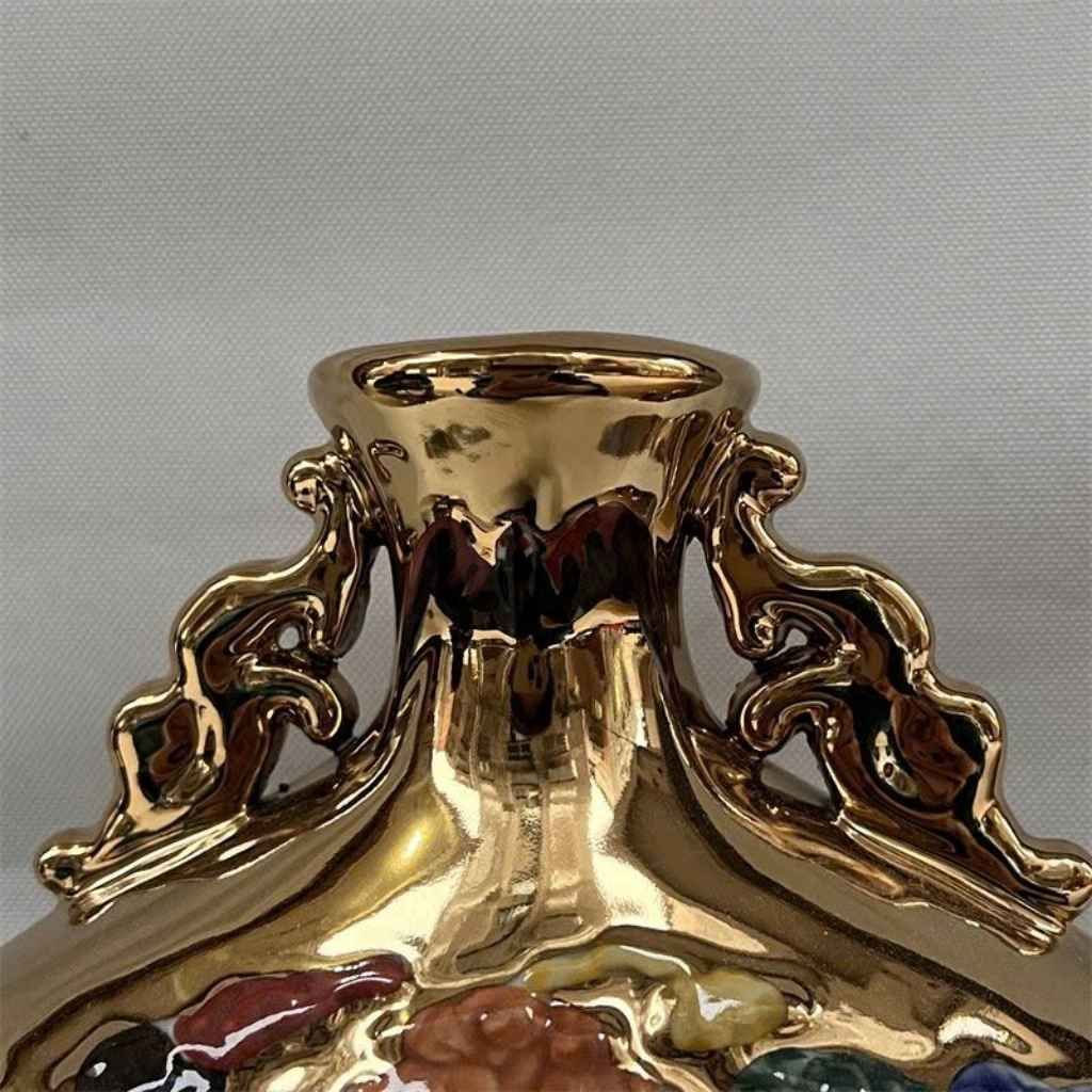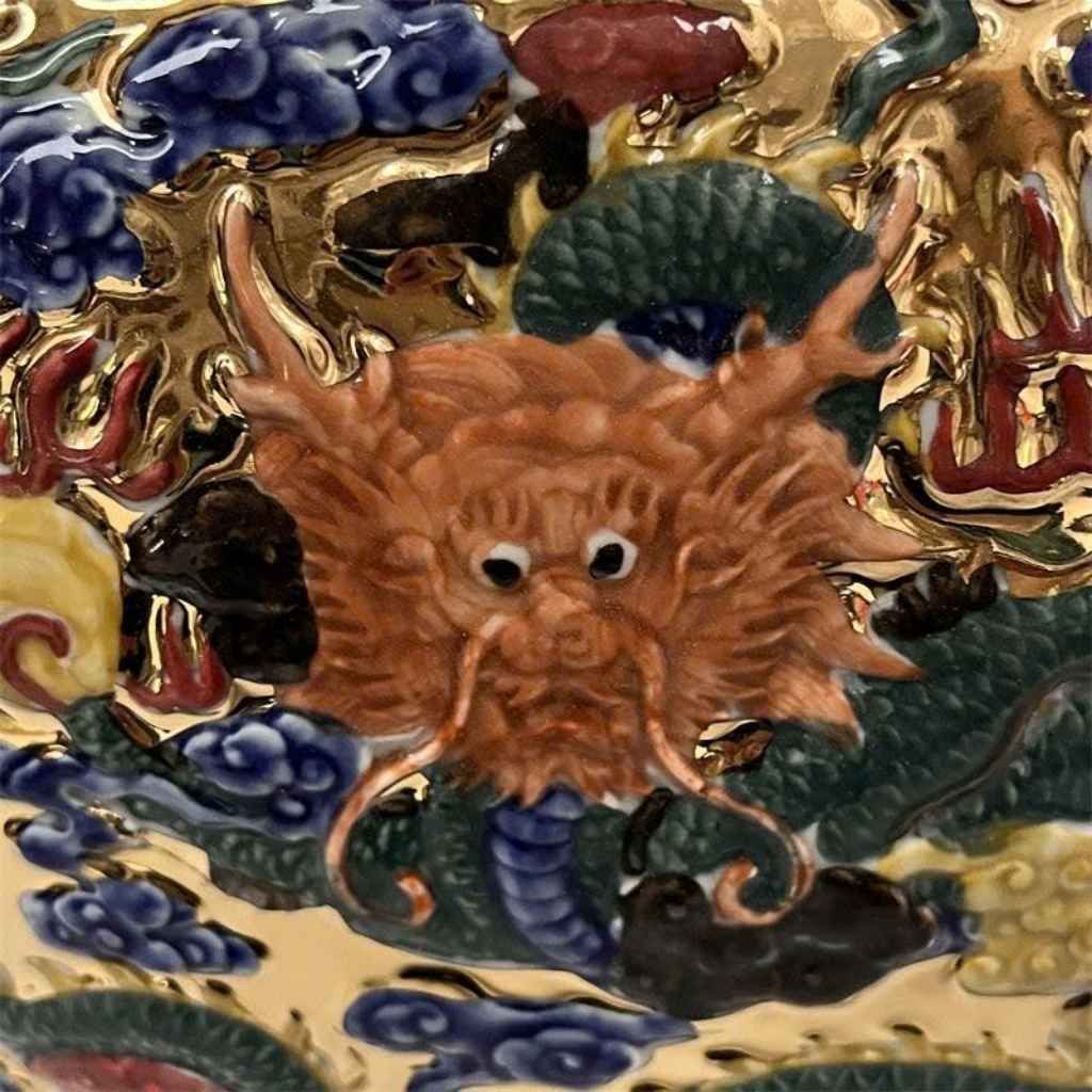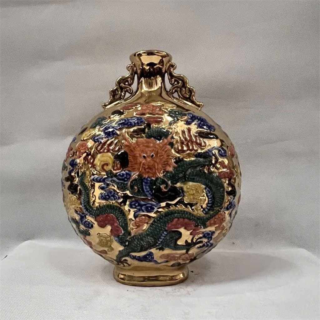 Toàn bộ bề mặt bình được tráng vàng sáng loáng, tạo lớp nền rực rỡ làm nổi bật họa tiết rồng đắp nổi với thần thái oai nghiêm. Vảy rồng, mây ngũ sắc được phối men tinh tế, tạo chiều sâu thị giác và cảm giác sống động. Hai bên cổ bình là đôi tai uốn cong cách điệu, tăng vẻ thanh thoát nhưng vẫn giữ nét uy nghi cho tác phẩm sưu tầm.