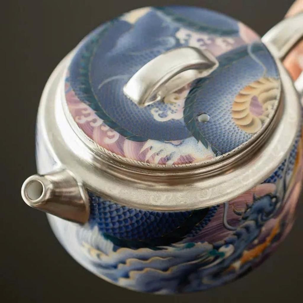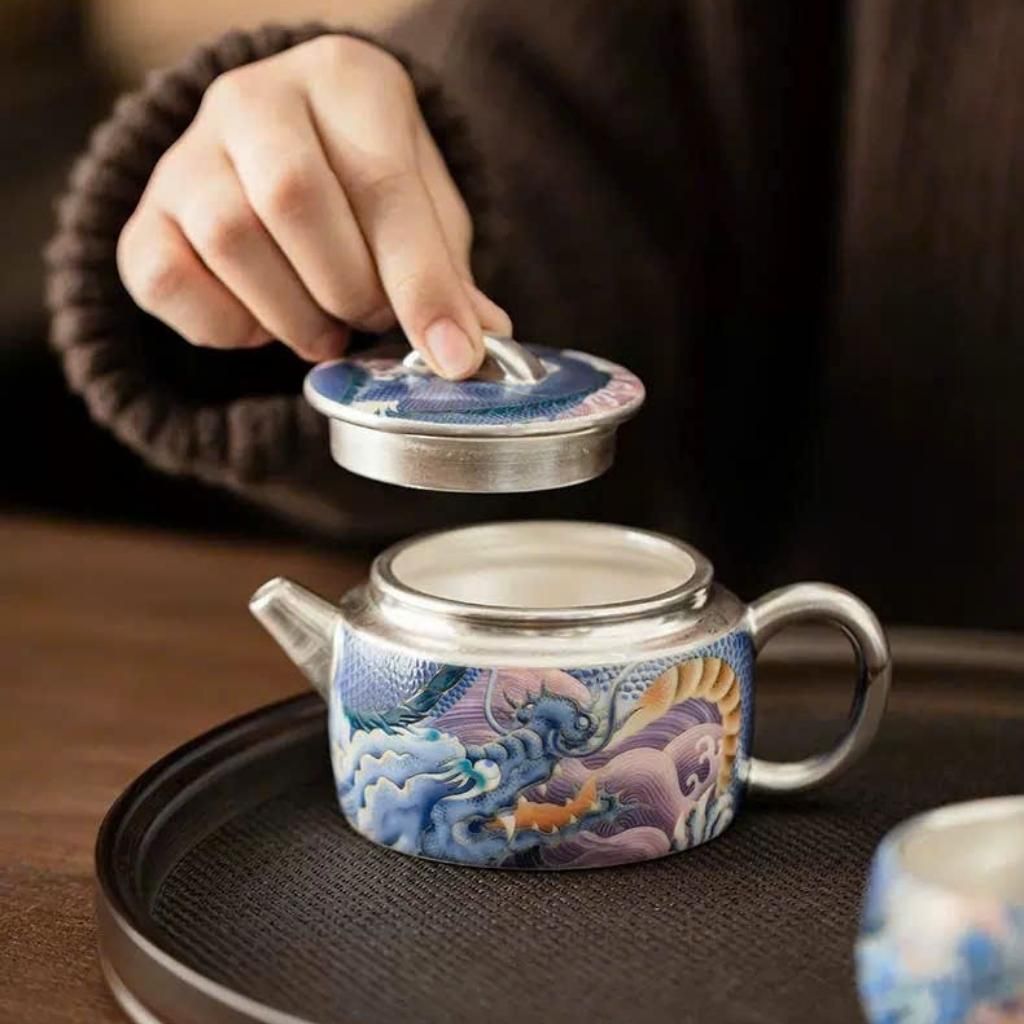 Bộ Ấm Chén Tráng Men Dát Vàng Cao Cấp – Họa Tiết Rồng/Lân Sang Trọng, Phong Thủy
