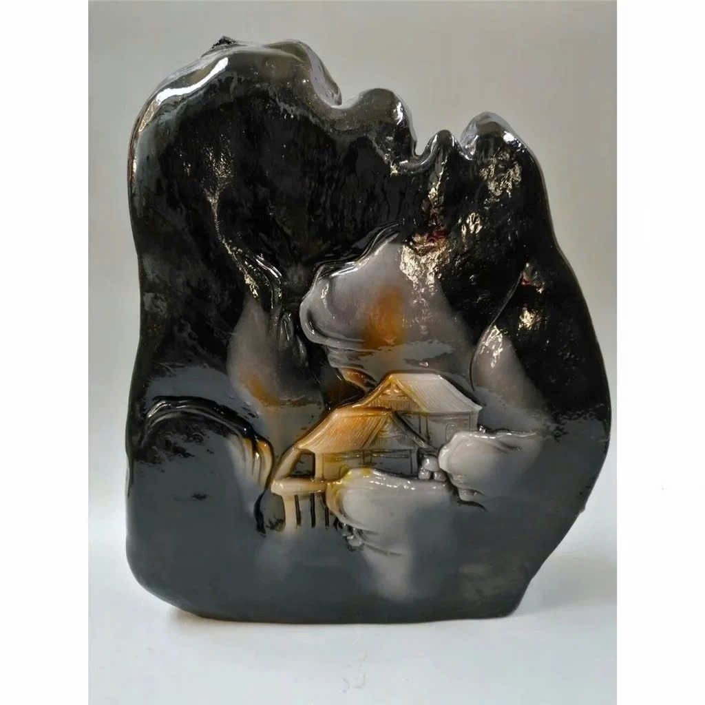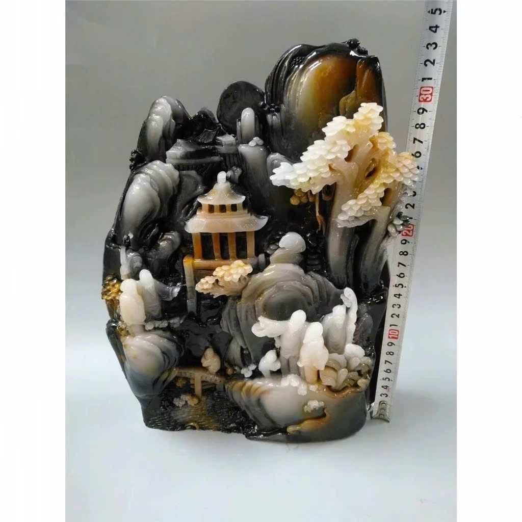 Tác phẩm được chế tác từ một khối ngọc lớn với độ chuyển màu tự nhiên hiếm có, kết hợp kỹ thuật điêu khắc tinh vi, tạo nên bức tiểu cảnh sơn thủy sống động như thật. Mỗi chi tiết, từ ngọn núi, ngôi đình đến dòng thác, đều thể hiện trình độ tay nghề đỉnh cao và sự tinh tế của nghệ nhân.