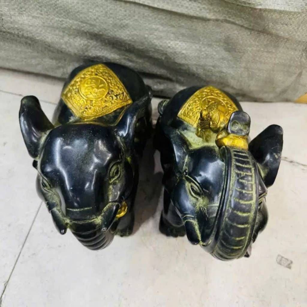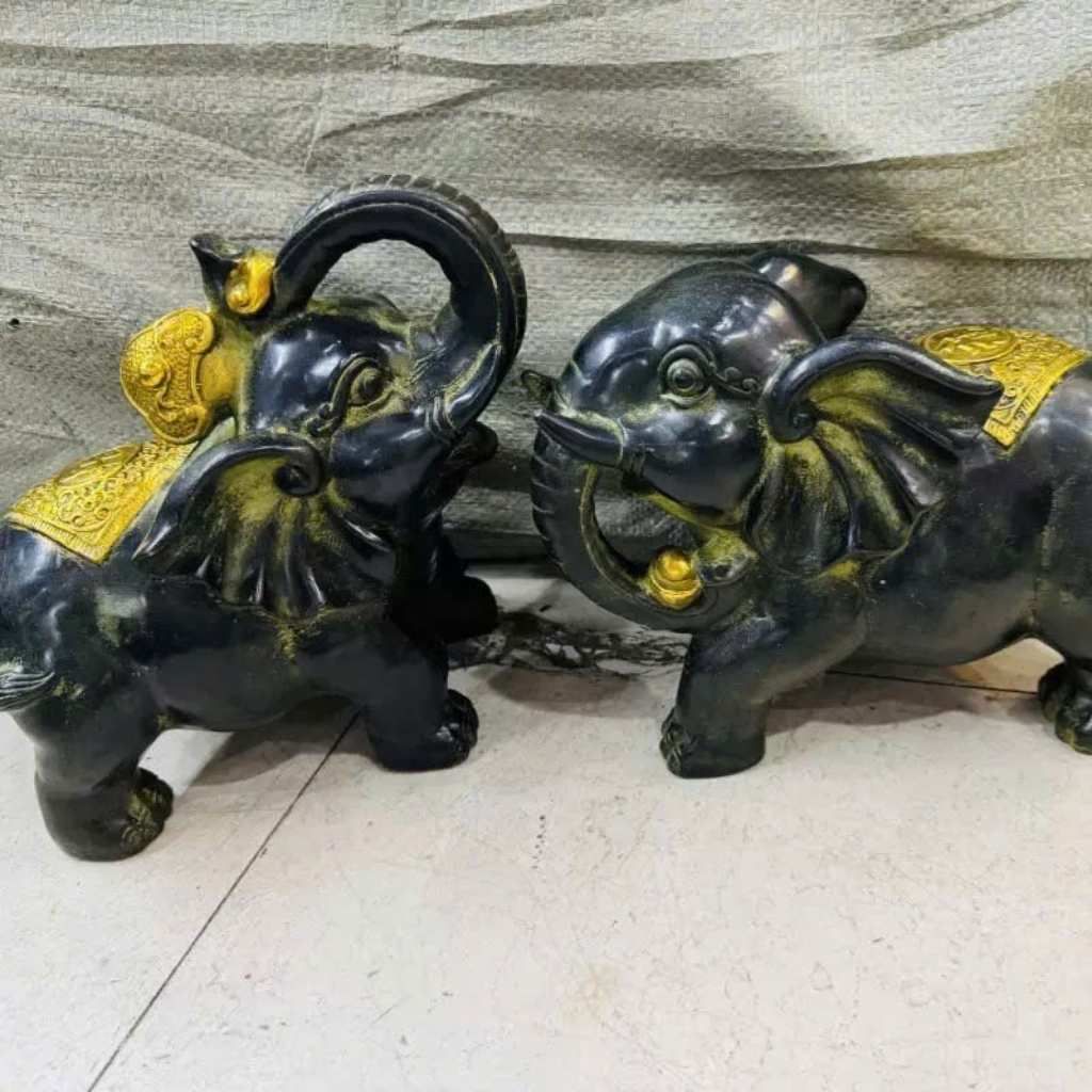 Cặp voi được tạo hình với dáng đứng vững chãi, đôi tai to bản, thân hình cân đối, mang thần thái uy nghi nhưng gần gũi. Bề mặt phủ men đen cổ điển, kết hợp chi tiết dát vàng nổi bật trên bành voi và trang sức, tạo nên tổng thể sang trọng và quyền quý.