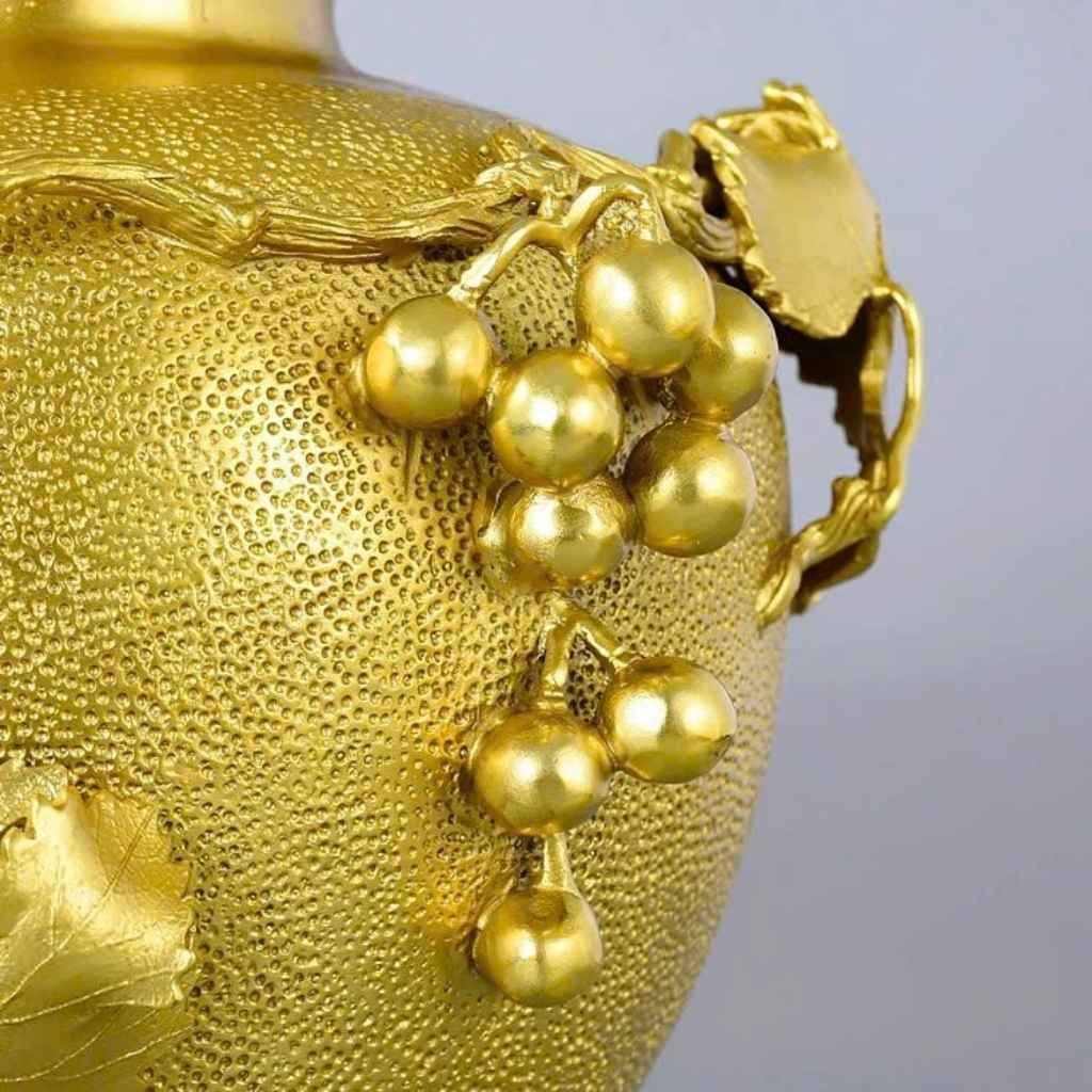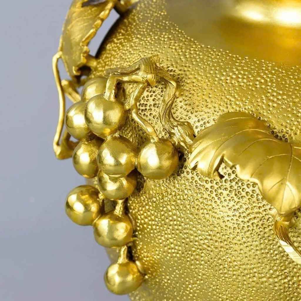 Chum được đúc từ đồng nguyên chất, mang sắc vàng đồng trầm ấm, bền bỉ theo thời gian. Họa tiết “Dây Nho” chạm nổi 3D uốn lượn mềm mại quanh thân chum, với những chùm nho căng mọng, trĩu quả và tán lá sắc nét, thể hiện rõ tay nghề khéo léo của nghệ nhân.