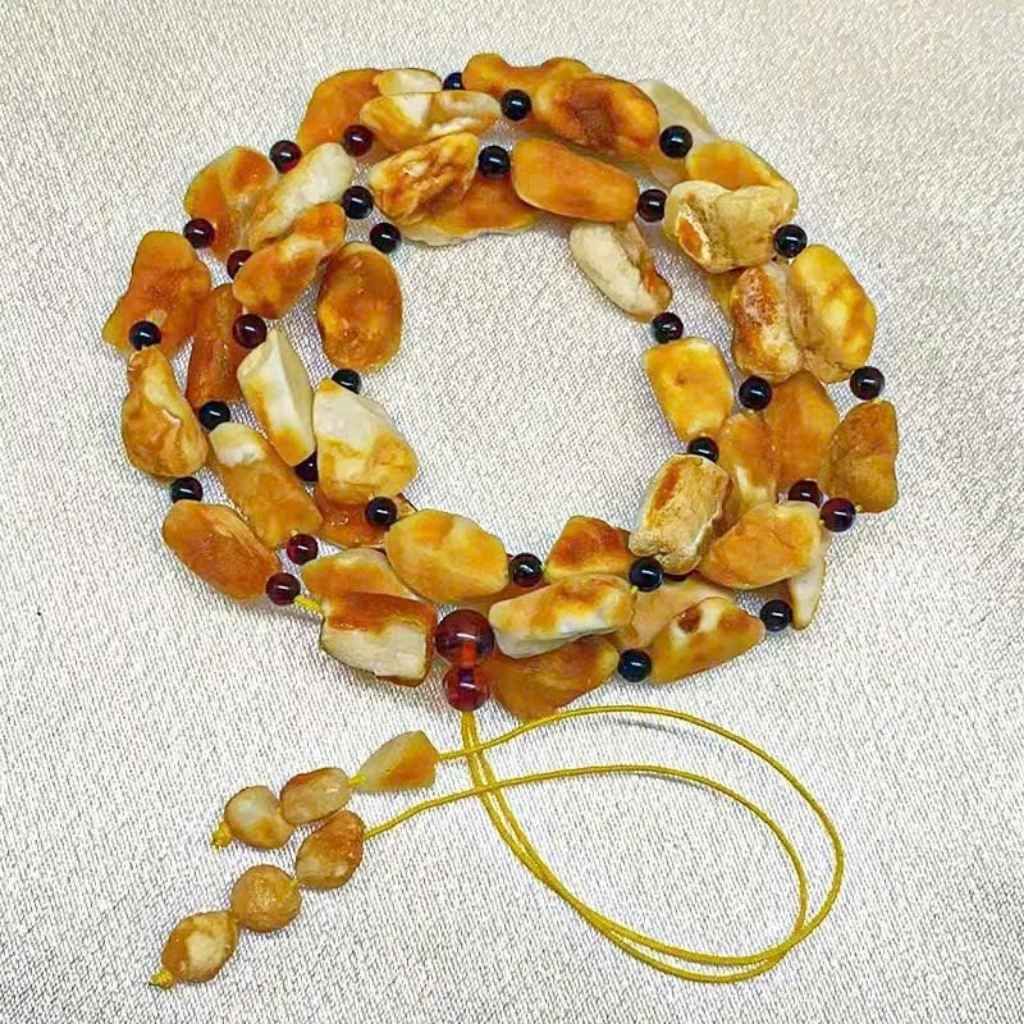 Chuỗi vòng được kết từ những viên đá hổ phách tự nhiên với gam màu vàng ấm áp, chuyển sắc từ trắng ngà đến vàng mật ong. Mỗi hạt đá mang hình dáng riêng, tạo nên vẻ đẹp mộc mạc nhưng không trùng lặp. Xen kẽ giữa các hạt lớn là những viên hạt nhỏ màu đỏ thẫm bóng bẩy, giúp tổng thể trở nên hài hòa, nổi bật và có chiều sâu thẩm mỹ.
