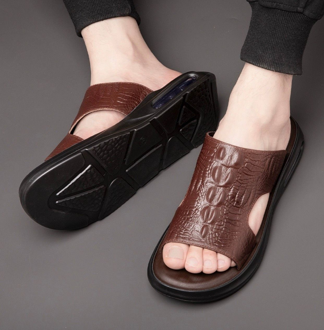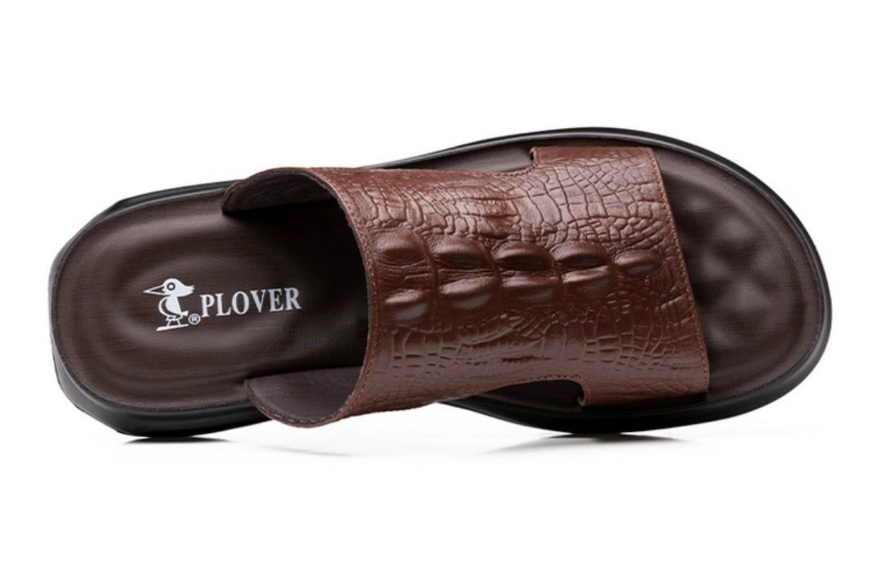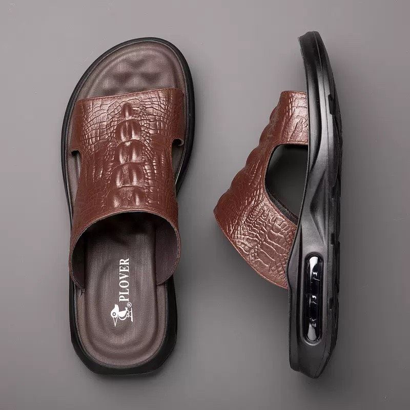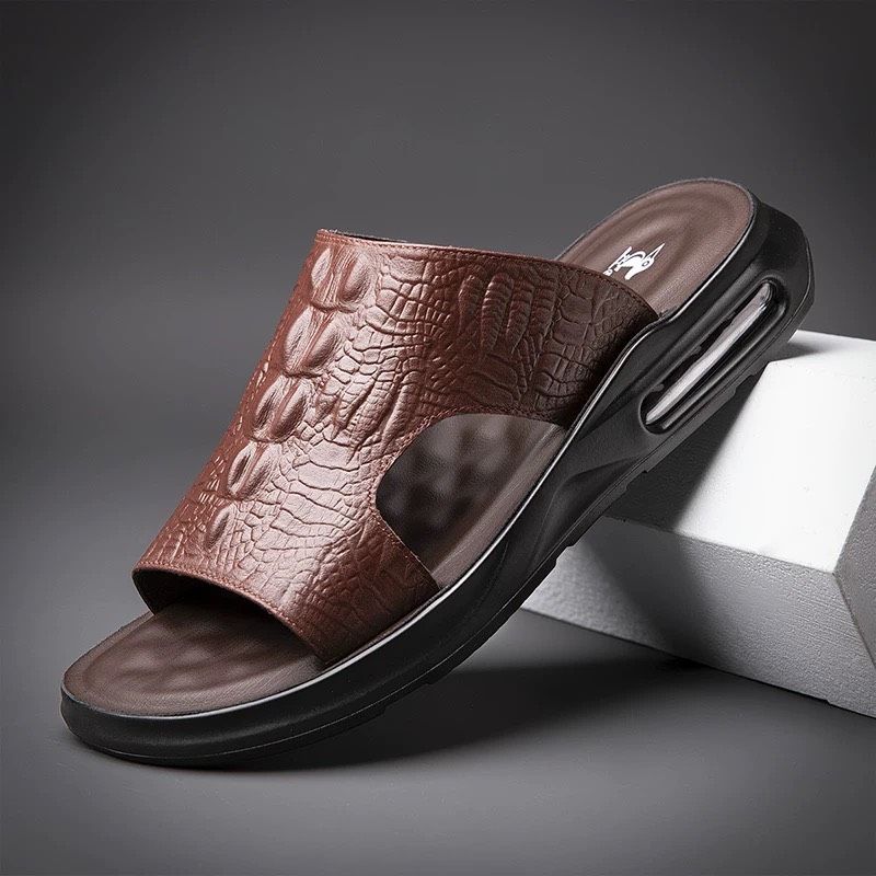 Dép nam da thật hoạ tiết cá sấu cao cấp Chất liệu da bò + đế polyuretan lót cao su Mùa áp dụng mùa hè