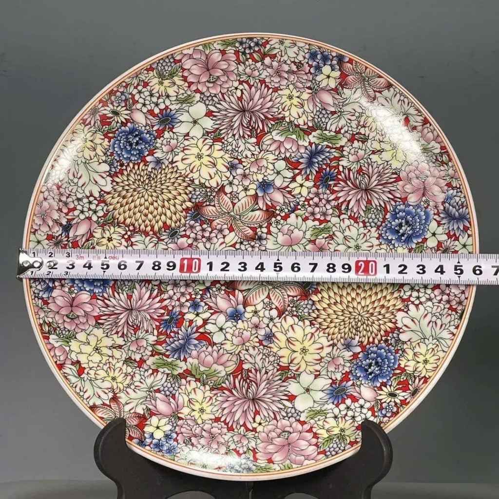Chiếc đĩa là sự kết hợp hài hòa giữa nền men đỏ son chói lọi và họa tiết hoa lá đa sắc, tạo nên một tác phẩm đậm chất nghệ thuật, thích hợp cho cả chơi, trưng bày và làm quà biếu sang trọng.