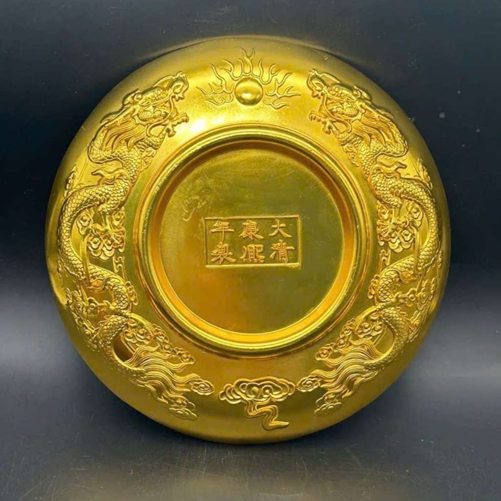 Chiếc đĩa đồng được mạ vàng toàn phần, bề mặt sáng bóng, phản chiếu ánh sáng sang trọng. Trung tâm đĩa chạm nổi hình ảnh năm vị thần Phúc – Lộc – Thọ tượng trưng cho may mắn, tài lộc và trường thọ. Đường nét tinh xảo, họa tiết cổ điển và bố cục hài hòa giúp vật phẩm trở thành điểm nhấn sang trọng, phù hợp bày ở phòng khách, bàn thờ Thần Tài hoặc làm quà tặng phong thủy cao cấp.