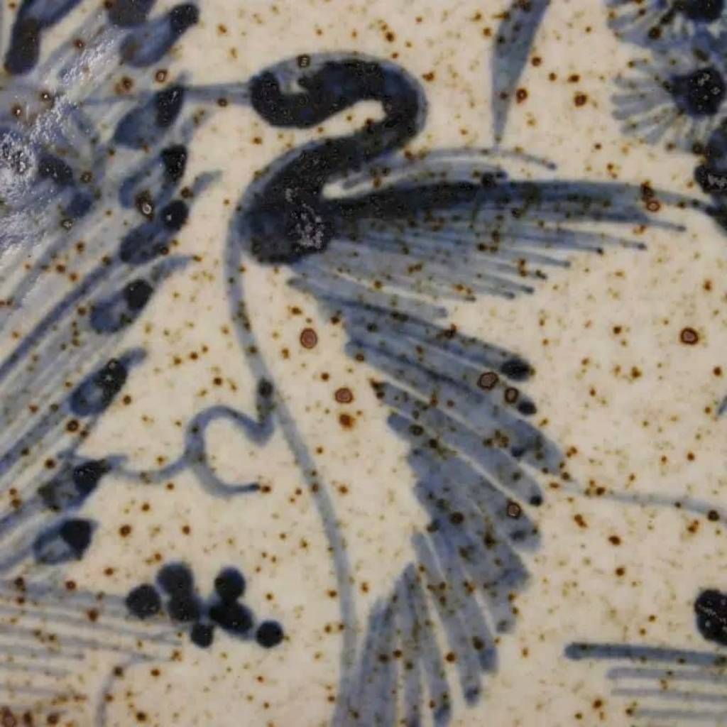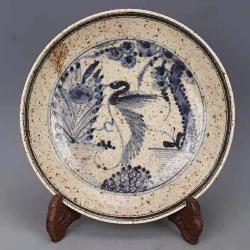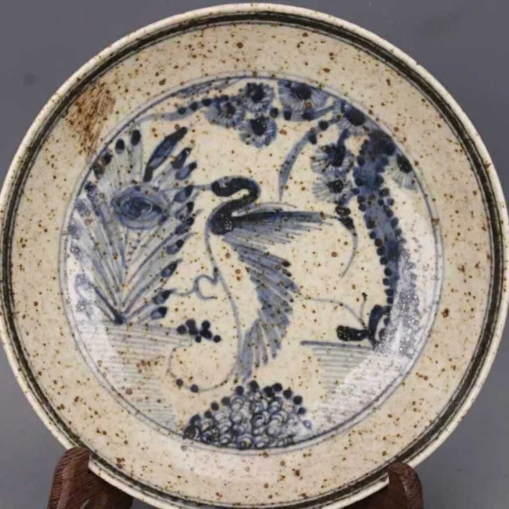 Chiếc đĩa gây ấn tượng mạnh với lớp men rạn dày, tạo nên những đường rạn tự nhiên vô cùng tinh tế. Trung tâm lòng đĩa là hình ảnh chim công được vẽ tay bằng lối phóng bút khoáng đạt, sử dụng sắc xanh lam chàm đặc trưng của dòng gốm xưa. Những chấm li ti trên bề mặt men (dấu hỏa biến hoặc dấu ấn thời gian) càng làm tăng chiều sâu thị giác và giá trị sưu tầm cho tác phẩm.