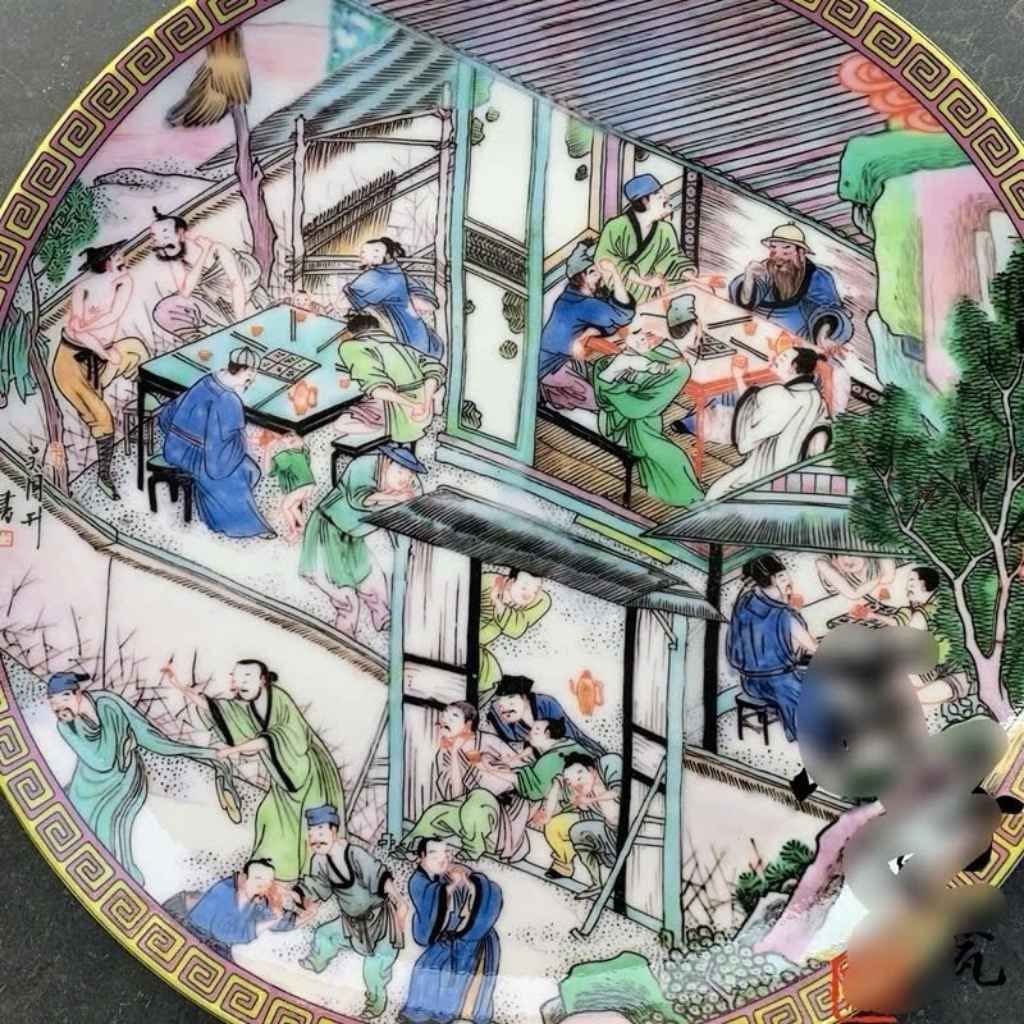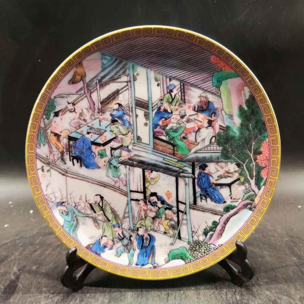 Lòng đĩa tái hiện sinh động một bức họa cảnh xưa vẽ tay hoàn toàn, nơi các nhân vật hiện lên với thần thái an nhiên, thư thái trong không gian lầu gác, thiên nhiên và kiến trúc cổ. Từng đường nét trang phục, dáng ngồi, cảnh vật đều được chăm chút kỹ lưỡng, tạo nên chiều sâu thị giác và cảm xúc hiếm có.