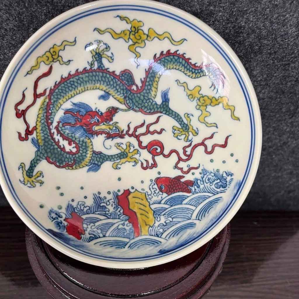 Điểm nhấn nổi bật của sản phẩm là hình ảnh Rồng thần uy nghi uốn lượn trên nền sóng xanh sống động, bên dưới là cá chép vàng đang vượt vũ môn. Tất cả được thể hiện bằng kỹ thuật vẽ tay tinh xảo, kết hợp hài hòa giữa sắc chàm truyền thống và các gam đỏ – vàng – lục nổi bật. Tổng thể tạo nên hiệu ứng thị giác rực rỡ nhưng vẫn giữ được nét thanh nhã, chuẩn phong cách mỹ nghệ cung đình.