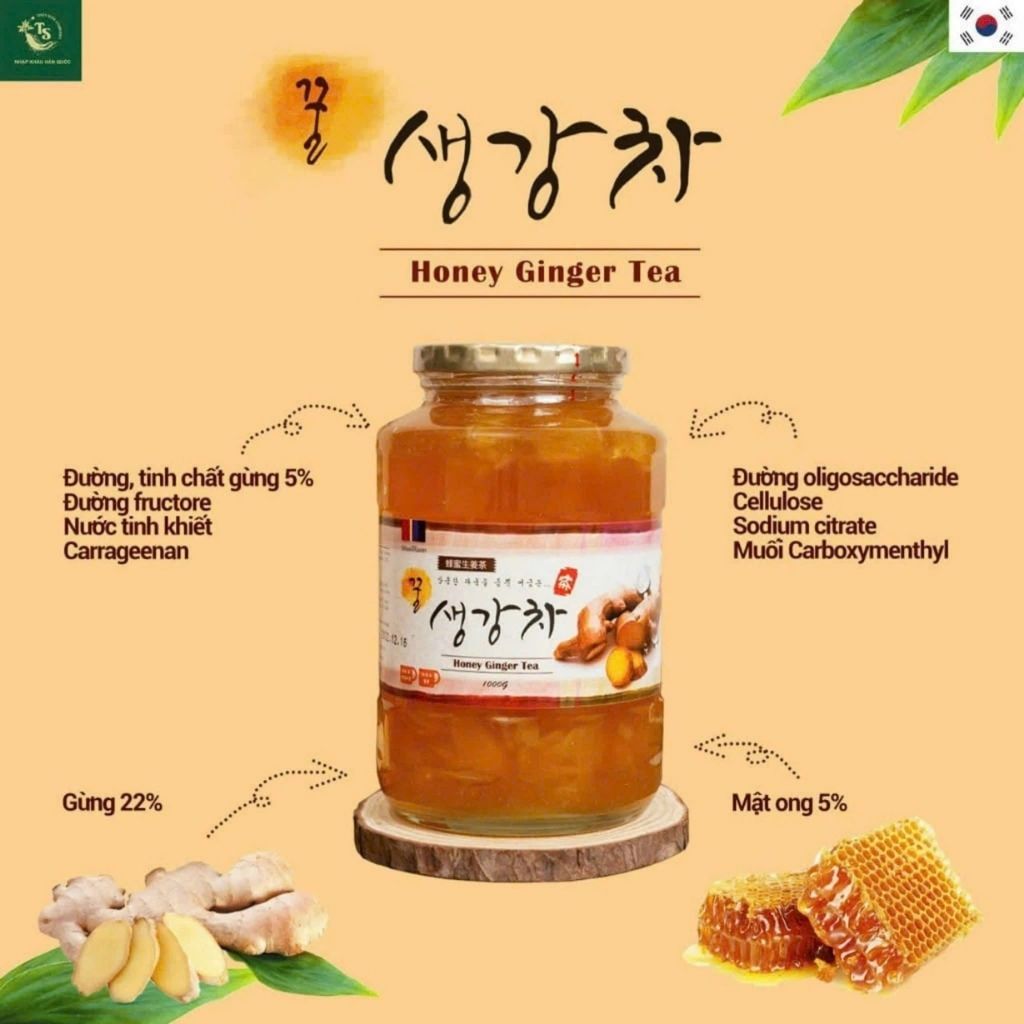 Thành phần: Gừng tươi Hàn Quốc thái lát, nước gừng, mật ong Hàn Quốc nguyên chất, đường biotic fructose (giúp dễ tiêu hóa), đường, acid citric, vitamin C.