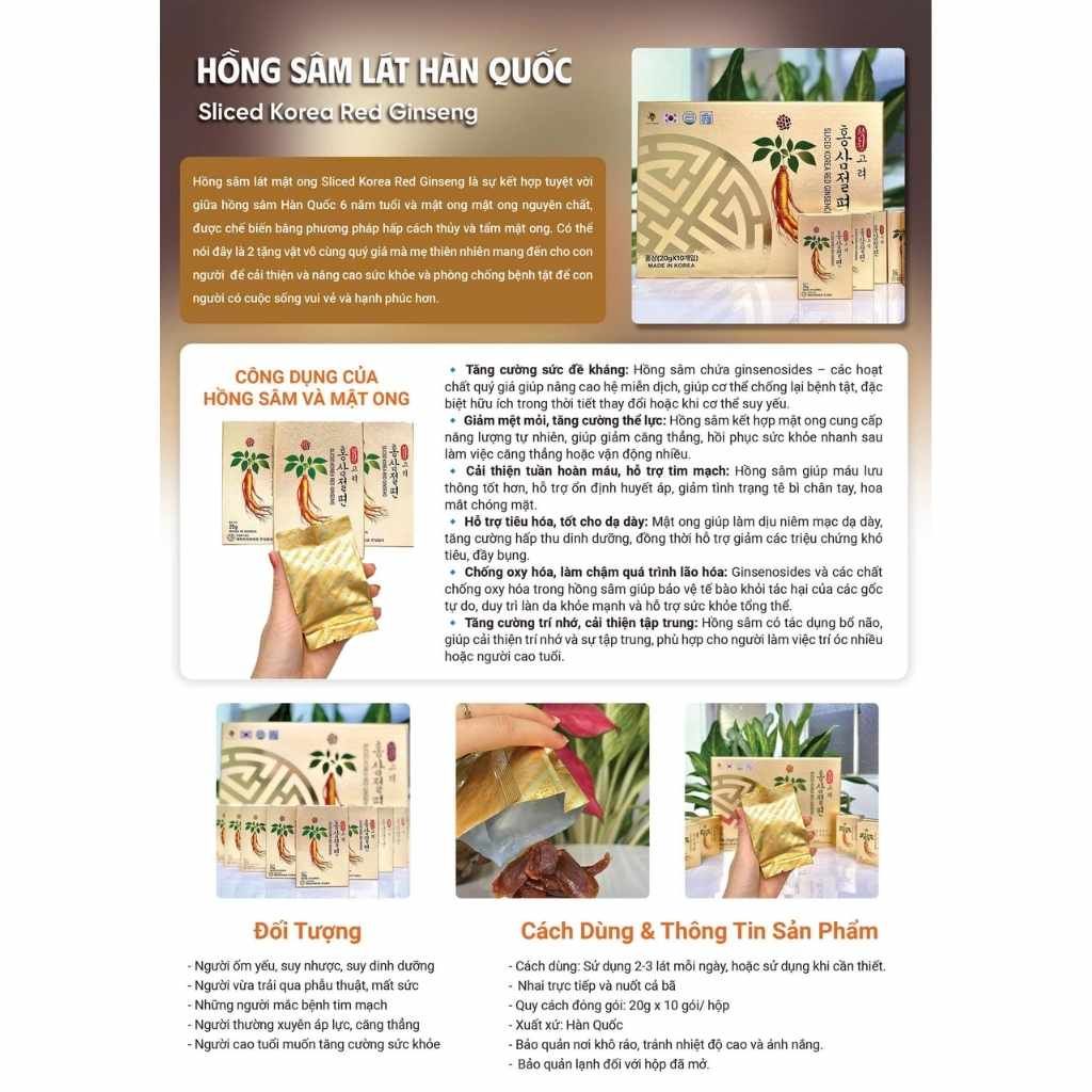 💞 Siêu phẩm hồng sâm Hàn Quốc làm hài lòng cả những khách hàng khó tính nhất! Nếu bạn yêu thích các sản phẩm chiết xuất từ nhân sâm nhưng lại ngại vị đắng, thì hồng sâm lát tẩm mật ong chính là lựa chọn hoàn hảo – vị ngọt thanh dịu từ mật ong hòa quyện với hương vị đặc trưng của hồng sâm, dễ dùng, dễ thưởng thức.
