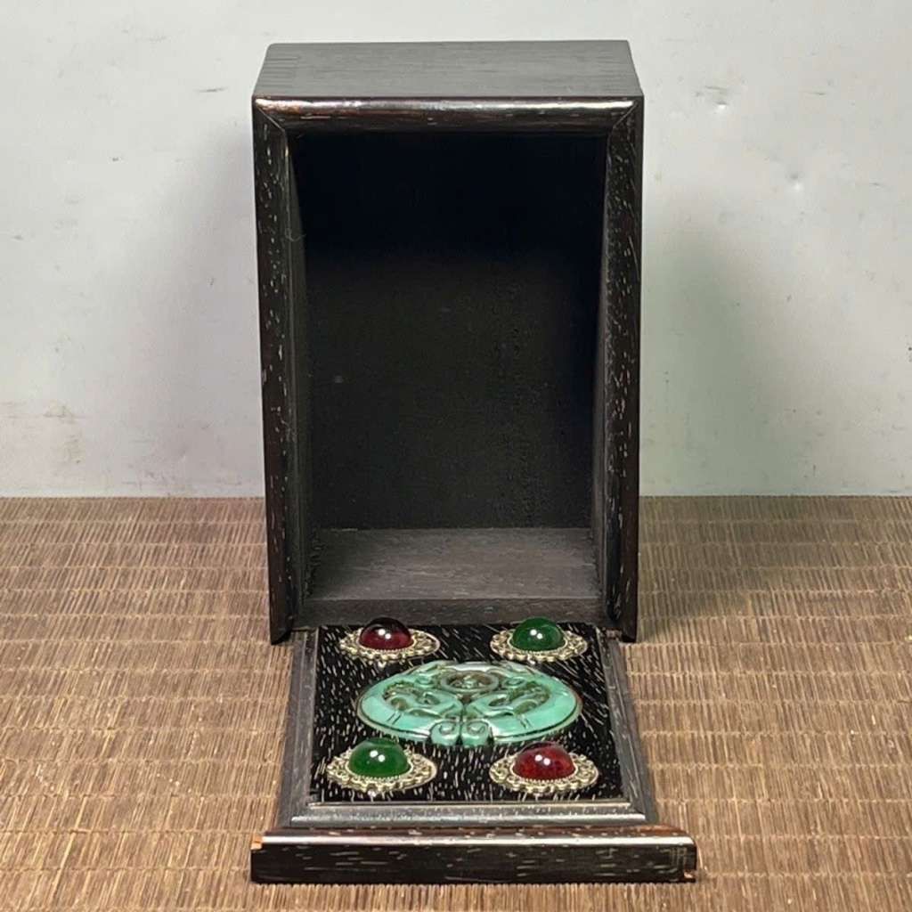 Chiếc hộp được chế tác từ gỗ tự nhiên lâu năm, nổi bật với những đường vân sẫm màu sâu và đều. Các góc cạnh được xử lý tinh tế, tạo cảm giác chắc tay và bền bỉ. Điểm nhấn đặc biệt nằm ở mặt trước gắn ngọc bích chạm nổi linh thú, bao quanh viên ngọc trung tâm, kết hợp cùng các viên đá màu ở bốn góc trong ổ kim loại chạm hoa văn cổ, mang lại vẻ đẹp vừa sang trọng vừa huyền bí.