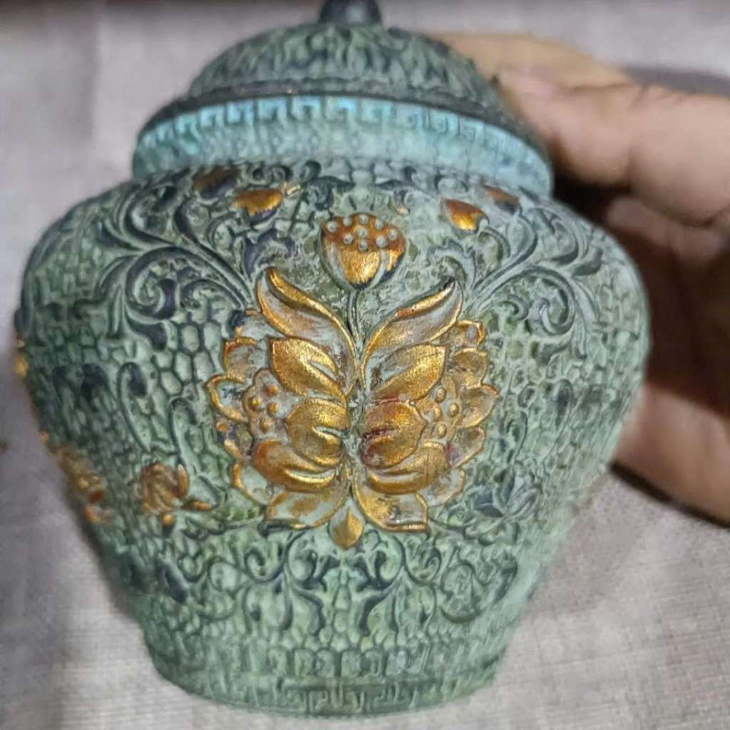 Sản phẩm gây ấn tượng bởi lớp màu xanh trầm mặc, tạo cảm giác như một món đồ cổ quý mang dấu ấn thời gian. Điểm xuyết trên nền đồng là họa tiết hoa sen chạm nổi tỉ mỉ, vừa nổi bật vừa hài hòa, thể hiện tay nghề chế tác thủ công tinh tế.
