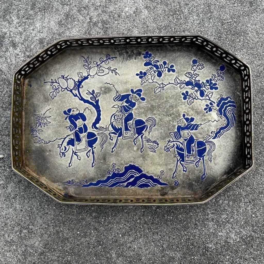Khay Trà Cổ Bằng Đồng Cũ Xưa – Họa Tiết Cobalt Độc Bản, Vẻ Đẹp Thời Gian