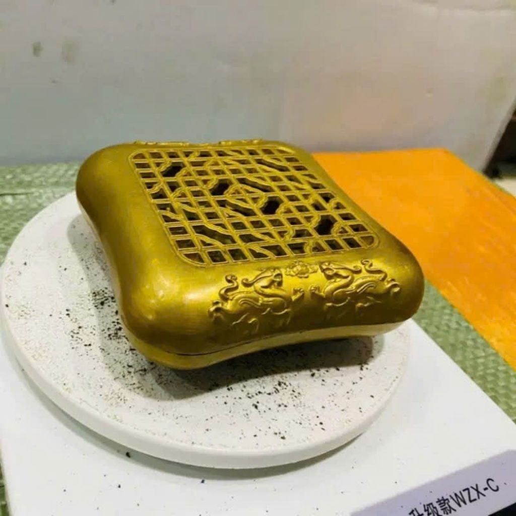 Cốt đồng dày giữ nhiệt tốt, nắp lư thoát khói đều giúp trầm cháy ổn định, mùi hương lan tỏa nhẹ và lâu, rất phù hợp cho người thường xuyên thưởng trầm.