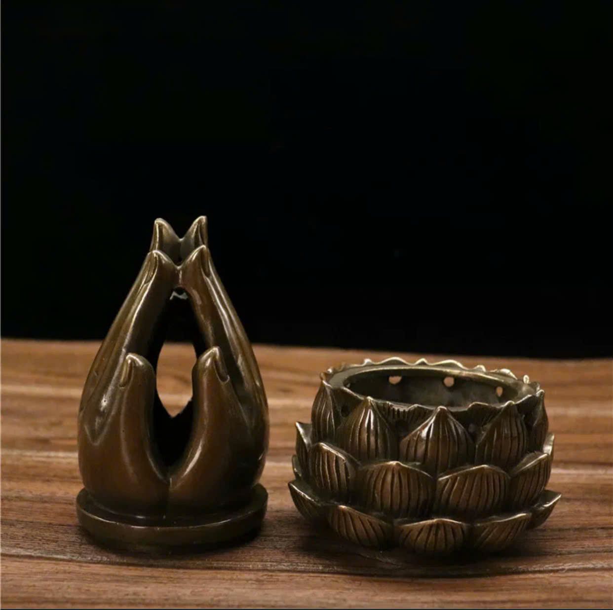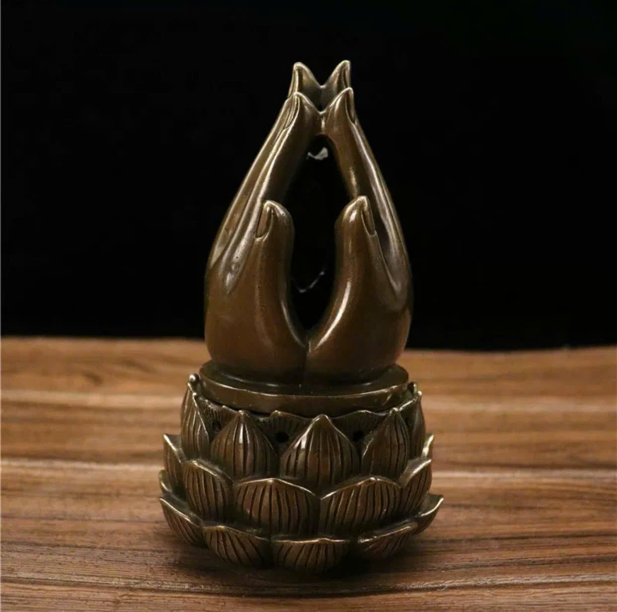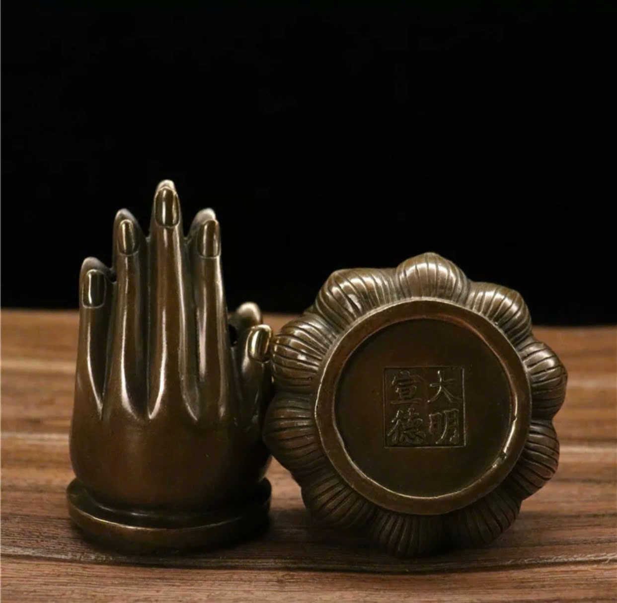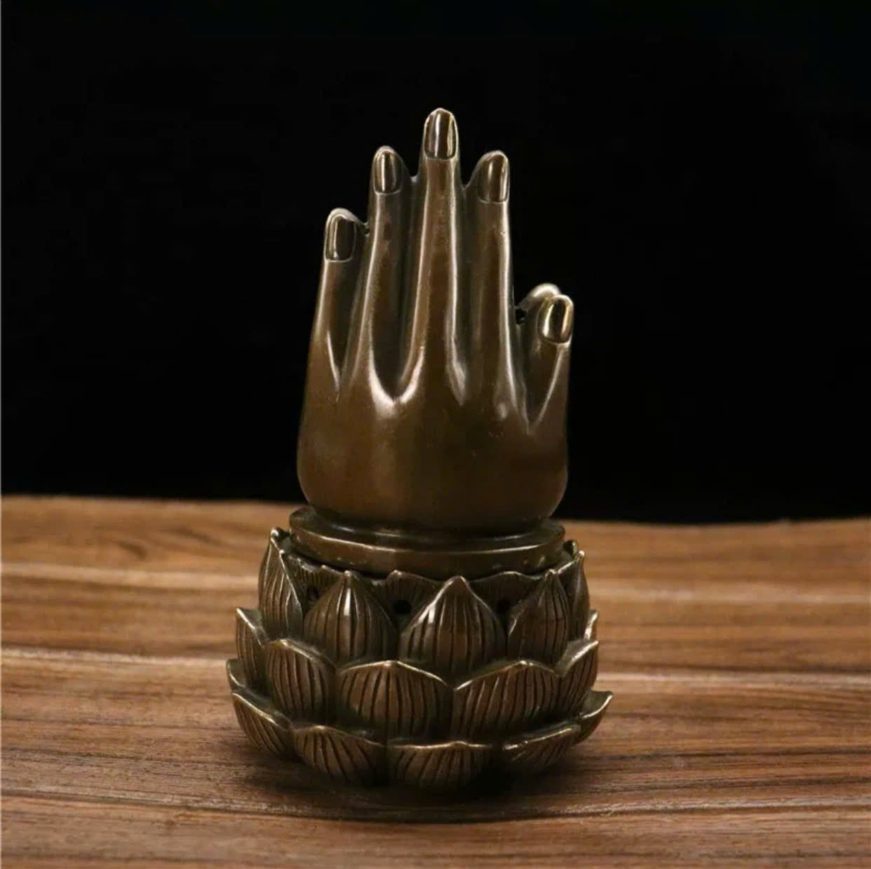 Lư hương bàn tay trên hoa sen chất liệu đồng sử dụng đồ trưng bày kt đế 11*11*18 nặng 0.69kg
