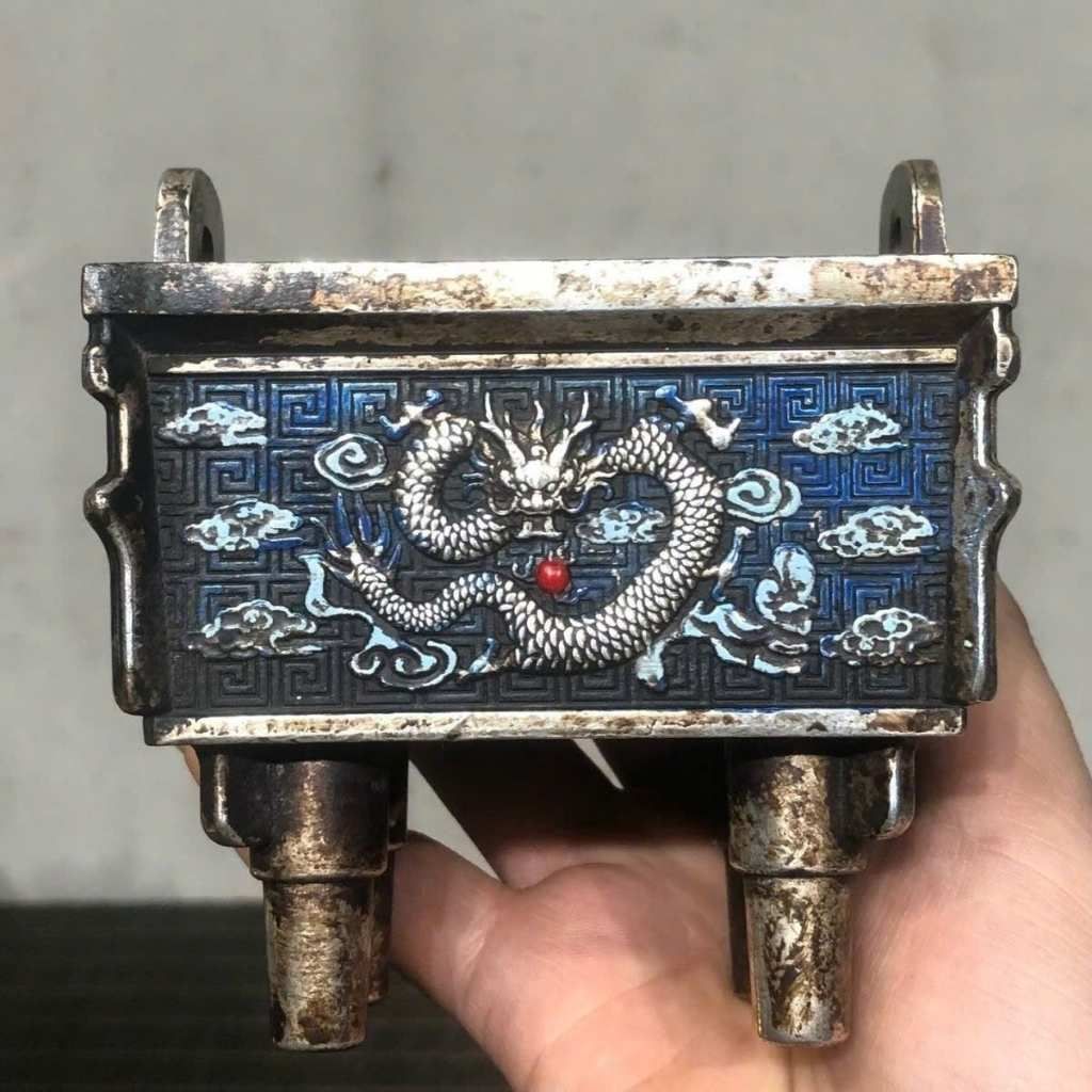 Lư Hương Đồng Mạ Bạc Họa Tiết Rồng Phong Thủy 9x7x9.5cm – Lư Hương Mini Sang Trọng Cho Bàn Thờ