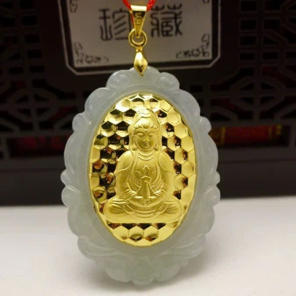 Tổng thể mặt dây chuyền là sự giao hòa giữa chất liệu ngọc thanh khiết và sắc vàng quý giá, vừa mang tính thẩm mỹ cao vừa chứa đựng ý nghĩa tâm linh sâu sắc.