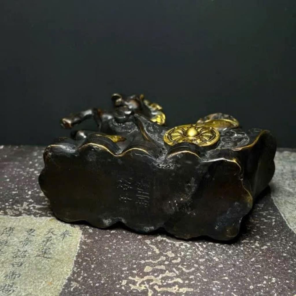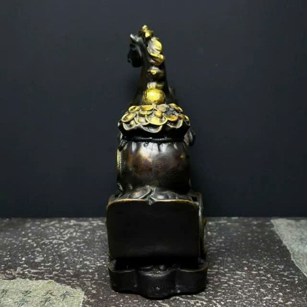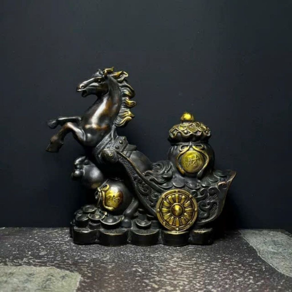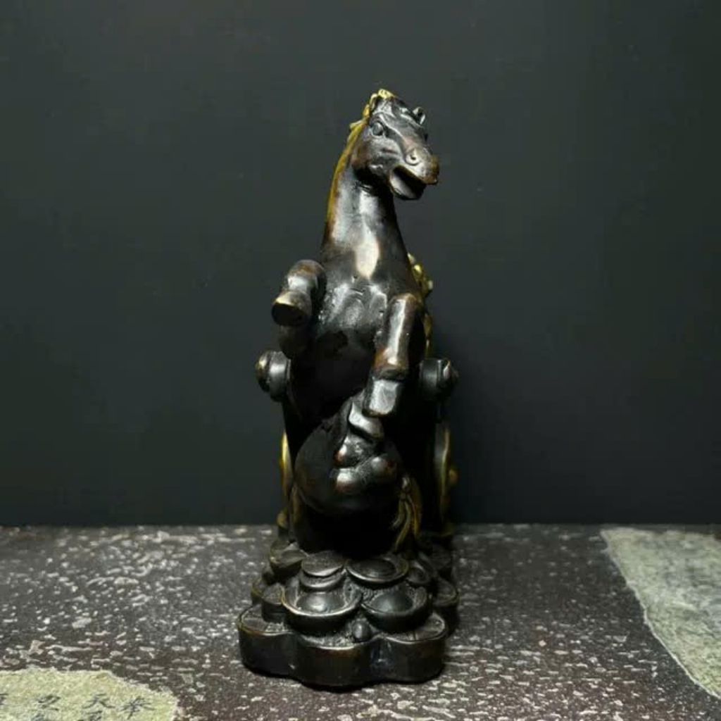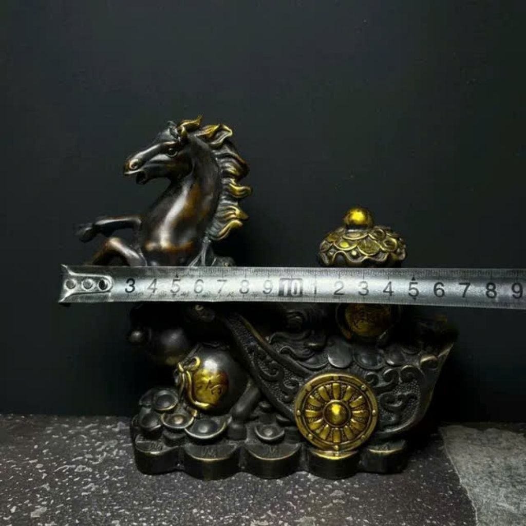 Bức tượng mang vẻ đẹp cổ kính và mạnh mẽ, với sắc đồng hun sẫm tạo chiều sâu, điểm nhấn bằng ánh vàng đồng sáng ở bờm ngựa và vật phẩm phía sau. Tác phẩm thể hiện hình ảnh chú ngựa chiến đang phi nước đại, biểu tượng của sức mạnh, tốc độ và sự thành công.