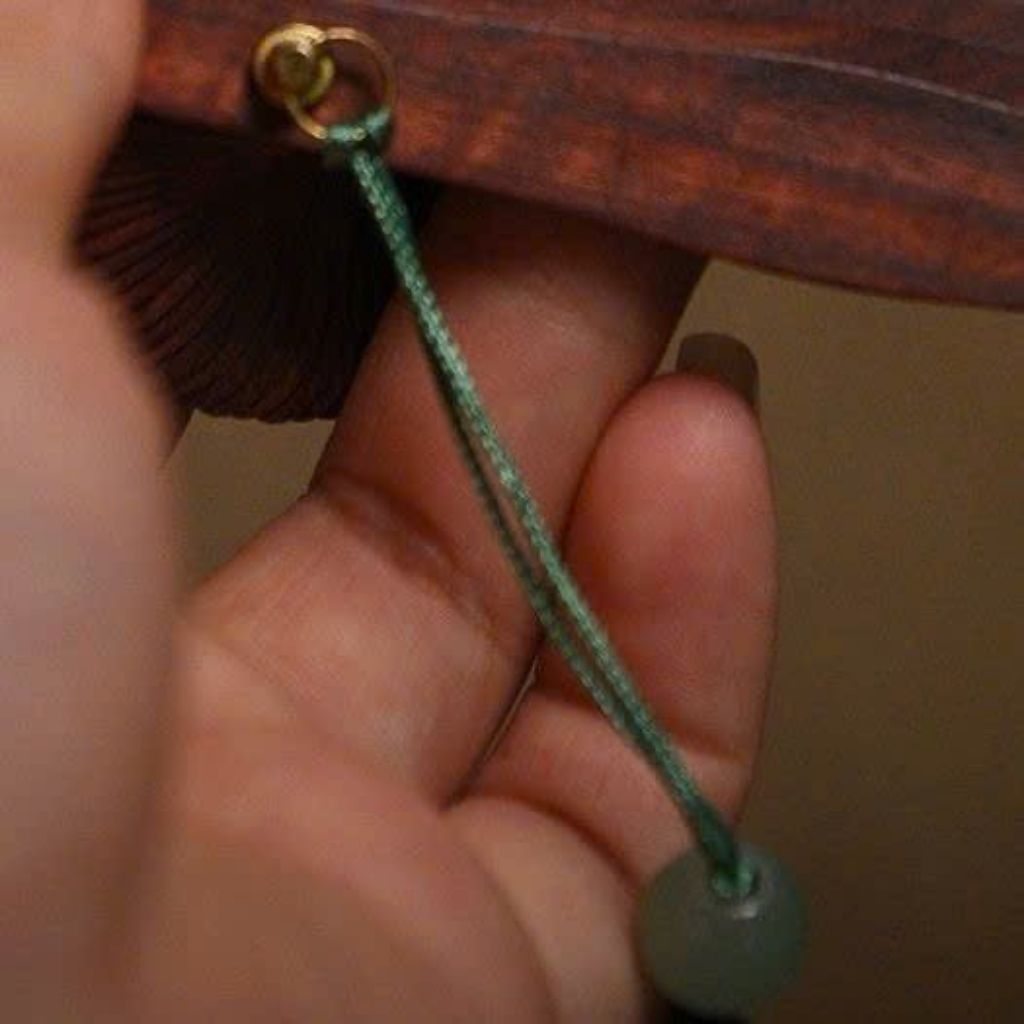 Quạt gỗ tượng trưng cho sự điều hòa, hài hòa và cân bằng. Tua rua xanh ngọc mang ý nghĩa bình an, may mắn, giúp không gian trở nên nhẹ nhàng và thư thái hơn.