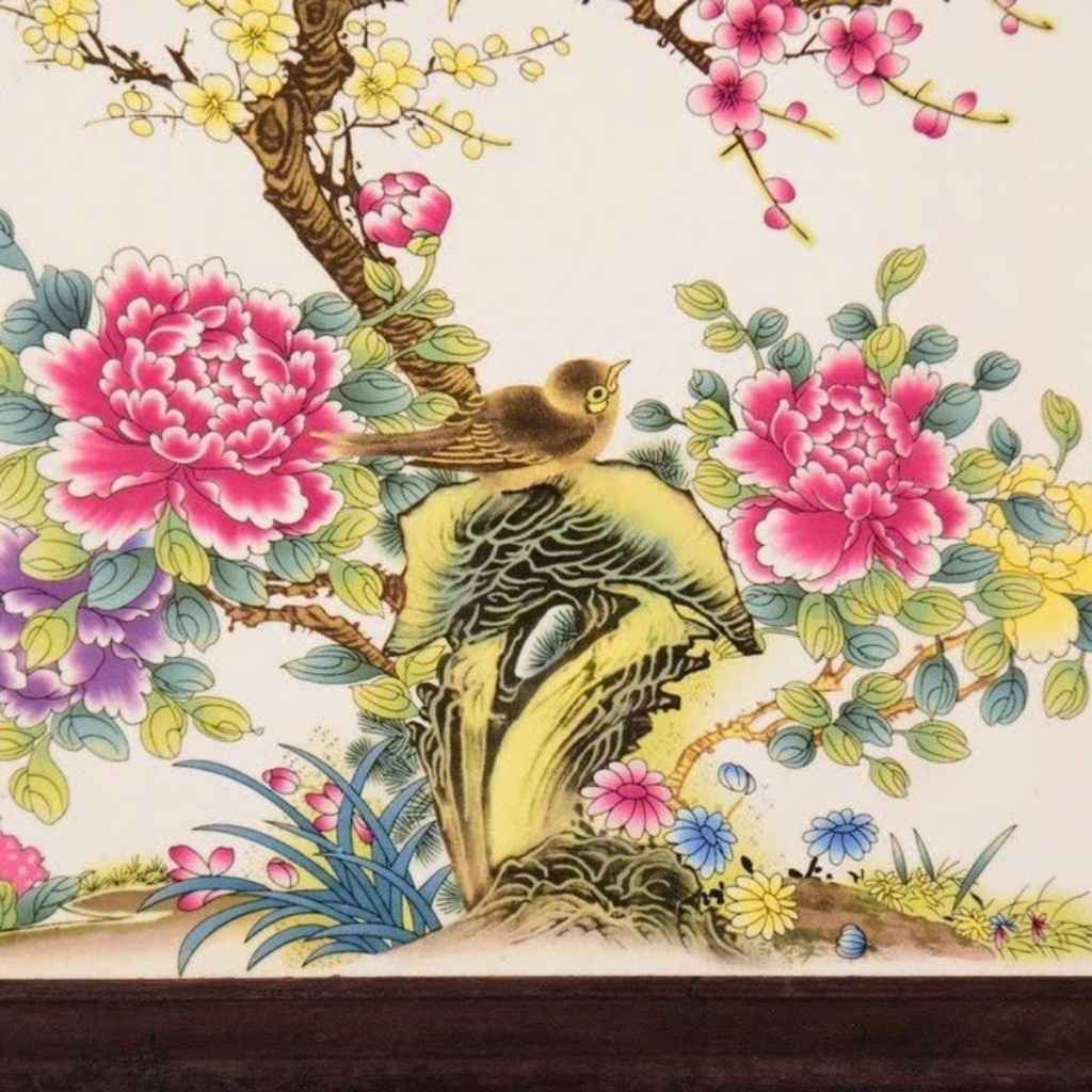 Hoa mẫu đơn sắc hồng rực rỡ – biểu trưng cho phú quý, vương giả. Đi kèm là đôi chim nhỏ, hoa cúc, hoa mai và tảng đá cổ, tạo bố cục hài hòa, vững chắc, mang ý nghĩa trường thọ – hạnh phúc lứa đôi – gia đạo bền lâu.
