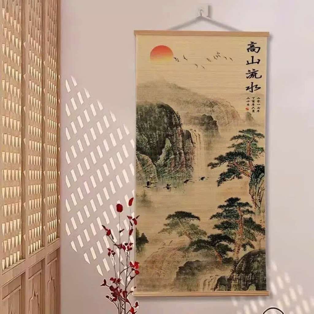 Bức tranh khắc họa hình ảnh cây tùng cổ thụ vươn cành mạnh mẽ giữa núi non trùng điệp, dòng sông xanh biếc và đàn chim bay lượn tự do. Từng chi tiết được thể hiện bằng bút pháp thủy mặc tinh tế, tạo nên tổng thể hài hòa, khoáng đạt và đầy chiều sâu.