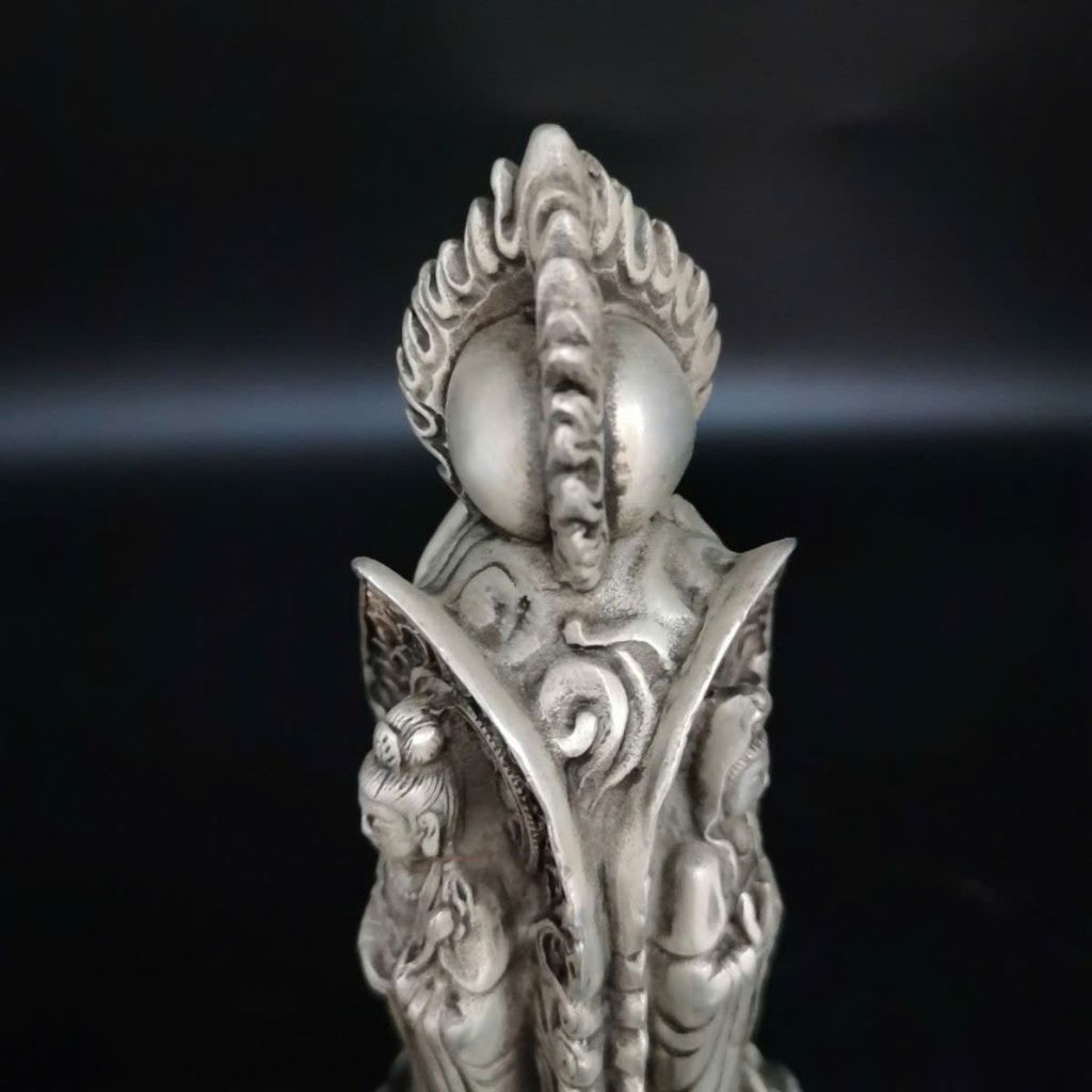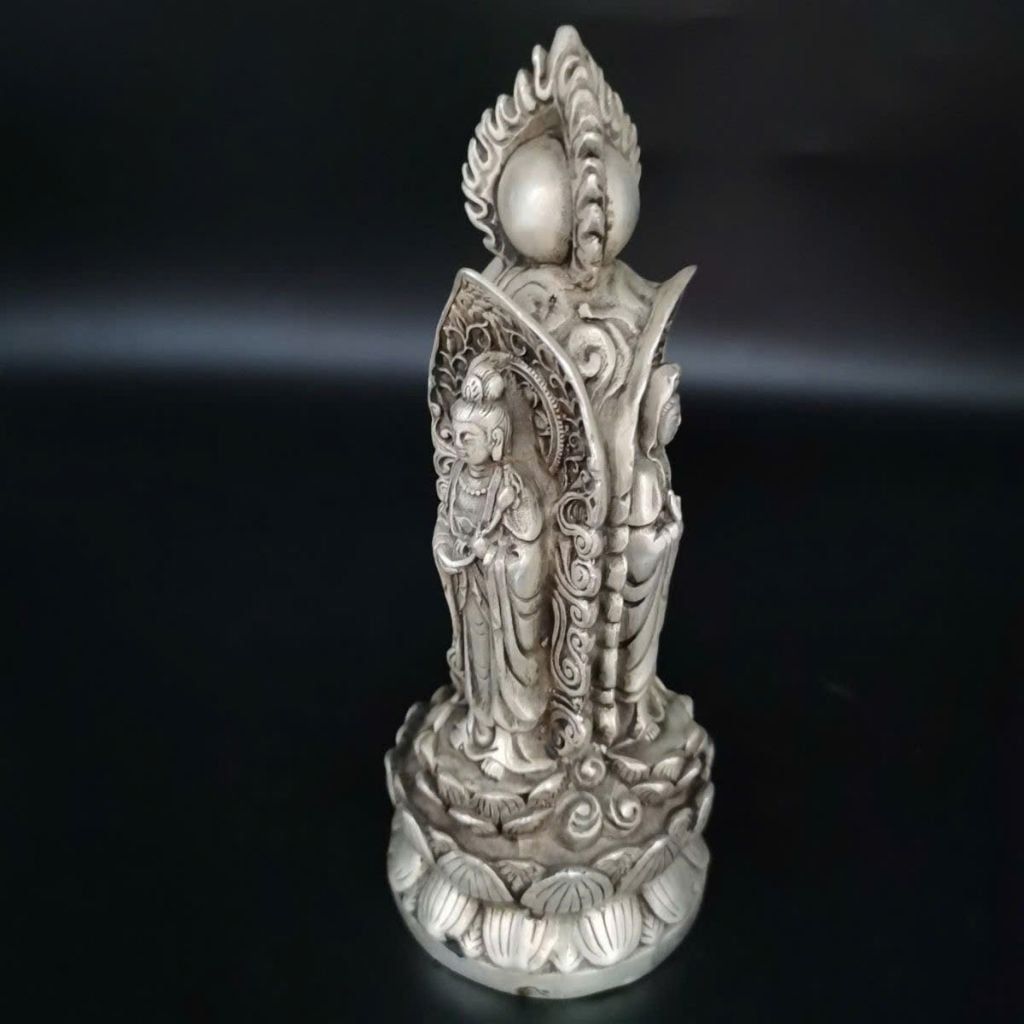 Chất liệu đồng nguyên khối kết hợp dát bạc giúp tượng bền đẹp theo thời gian, dễ vệ sinh, giữ được vẻ trang nghiêm lâu dài trong không gian thờ tự.