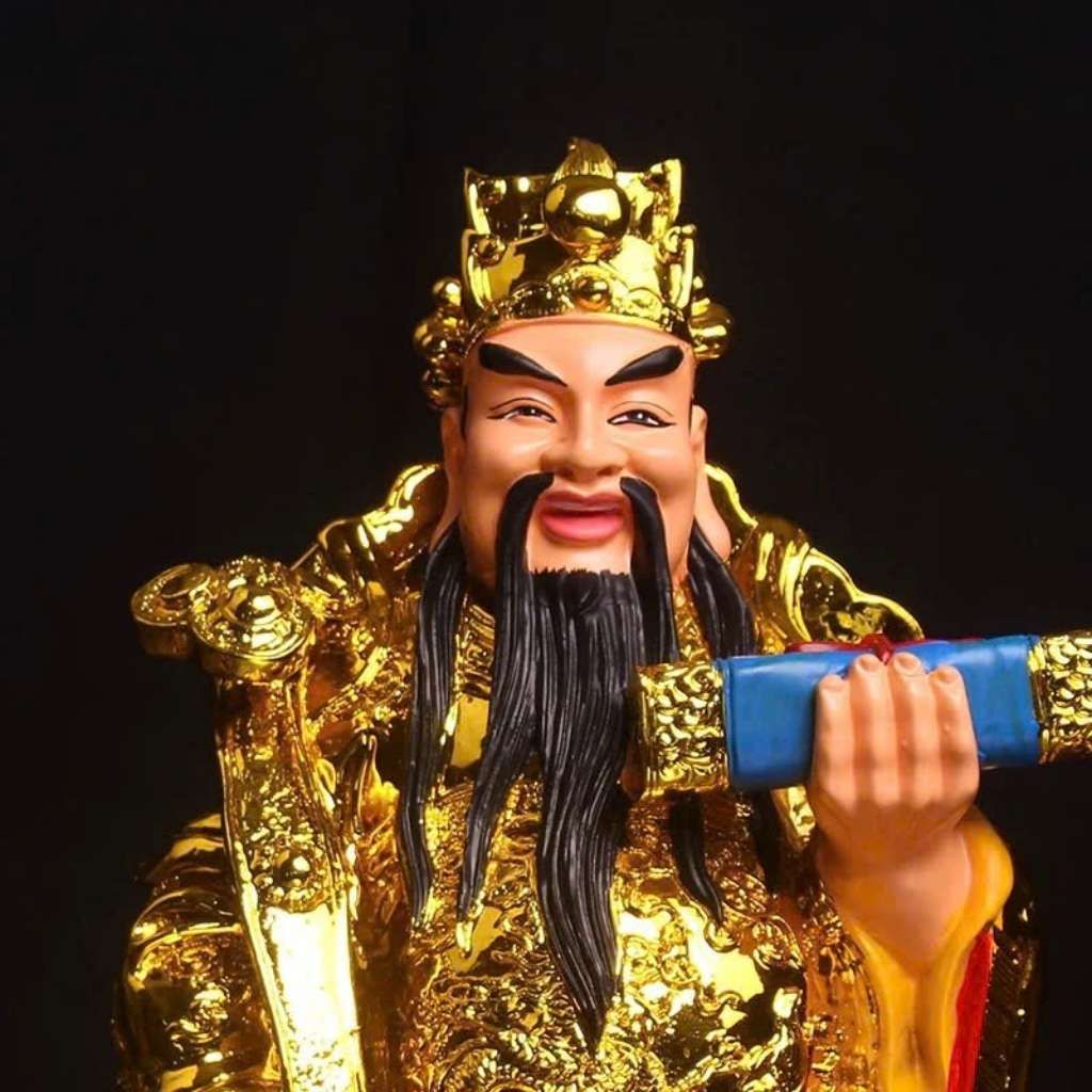 Điểm đặc biệt nằm ở kỹ thuật phối màu đa sắc tinh xảo trên nền đồng cổ, kết hợp các gam đỏ – xanh – nhũ vàng nổi bật. Từng đường nét áo bào, đai ngọc, hoa văn rồng mây đều được chạm trổ thủ công tỉ mỉ, mang đến vẻ đẹp sang trọng và đậm chất truyền thống.