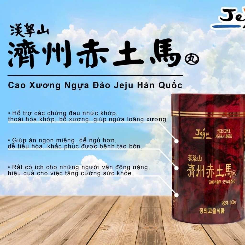 Cao xương ngựa đảo Jeju Hàn Quốc là sản phẩm nổi tiếng được nghiên cứu và phát triển bởi Bio Pharma CO.Ltd, Jeju, Korea, được bảo trợ bởi SamSung. Sản phẩm dạng viên hoàn này được chiết xuất từ xương ngựa lùn đảo Jeju, kết hợp với bột nhân sâm và các thảo dược đặc biệt chỉ có tại đảo Jeju. Viên cao này giúp ngăn ngừa các vấn đề về loãng xương, thoái hóa khớp và hỗ trợ quá trình điều trị các bệnh xương khớp.