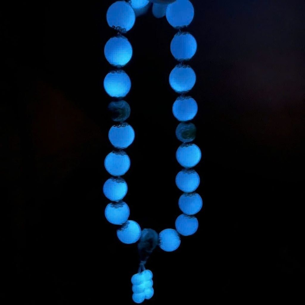 Chất liệu: Hạt dạ quang trắng + hạt khắc hoa văn xanh ngọc