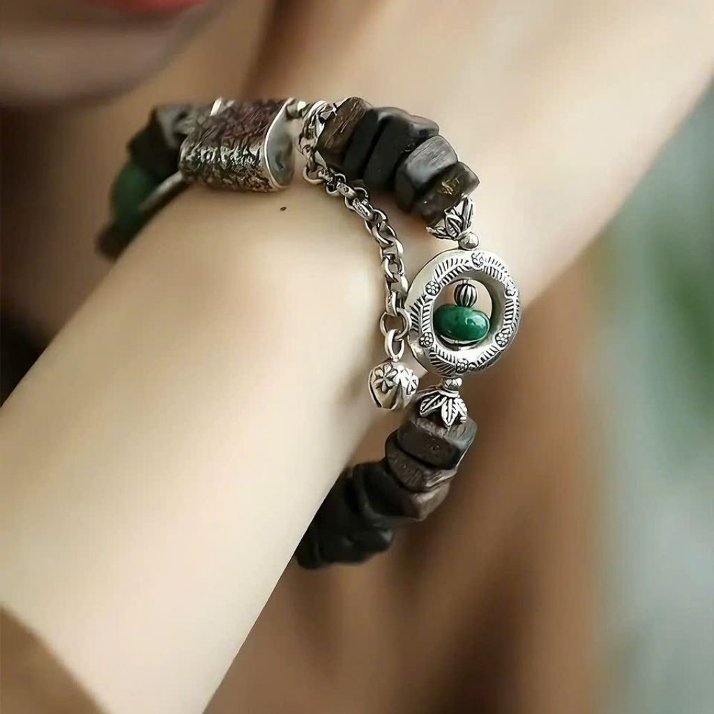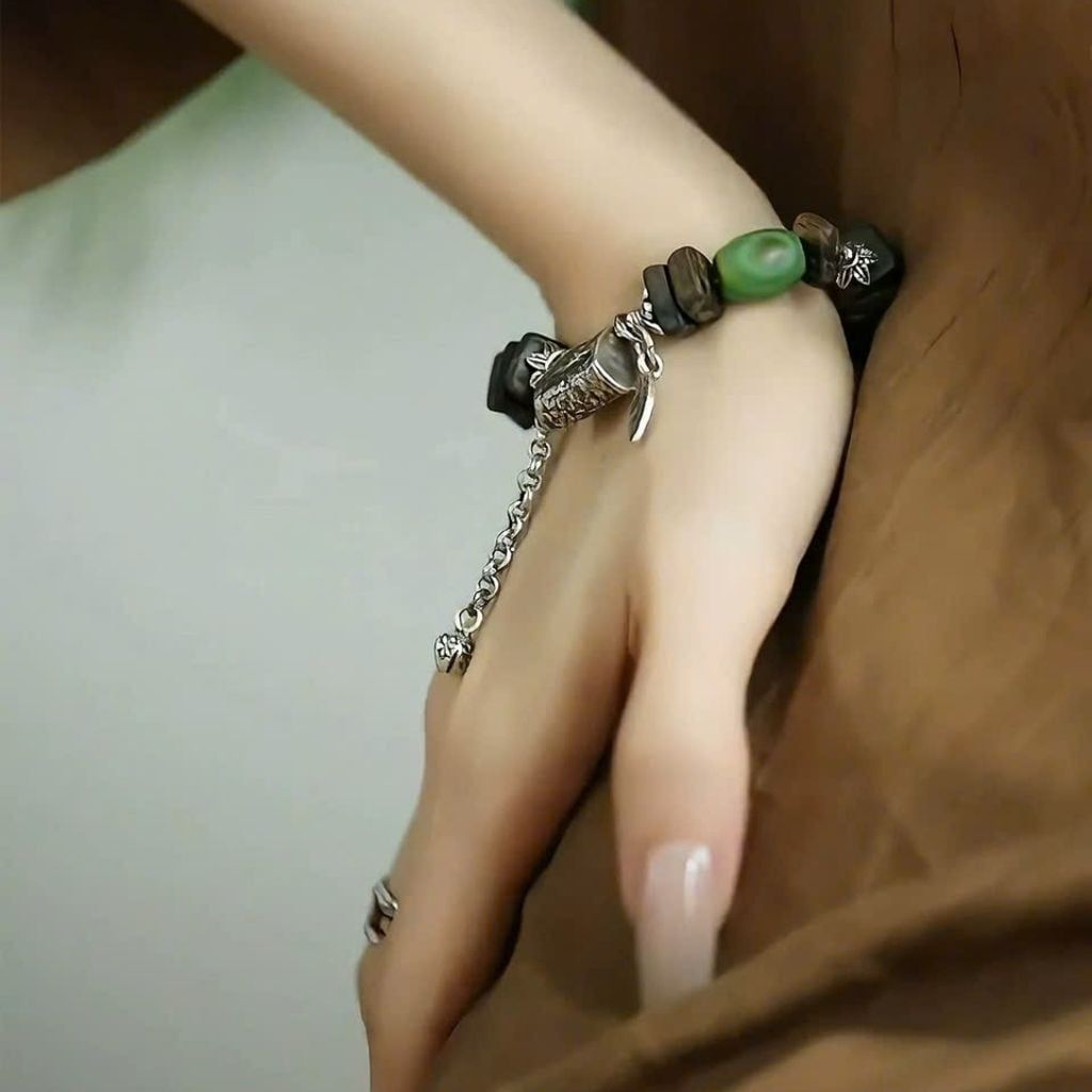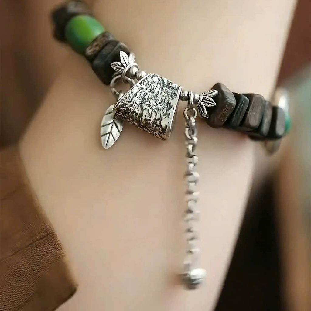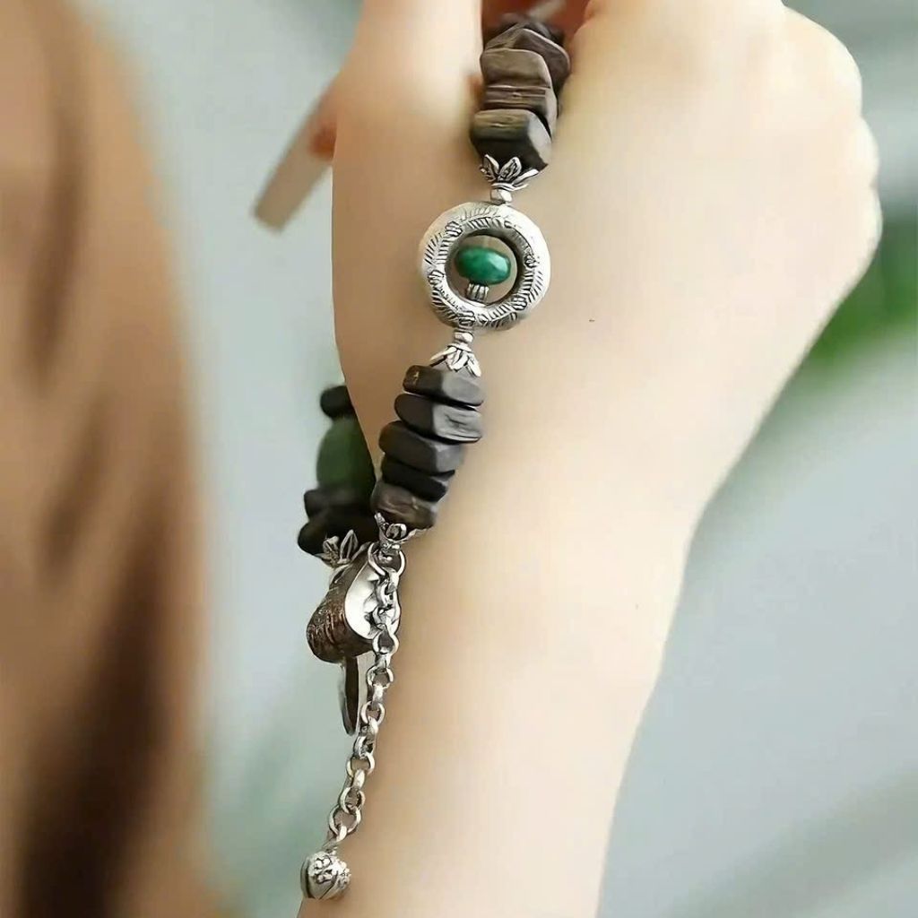 Thiết kế: Hạt gỗ màu tối xen kẽ hạt xanh lục, điểm xuyết mặt charm bạc chạm khắc tinh xảo