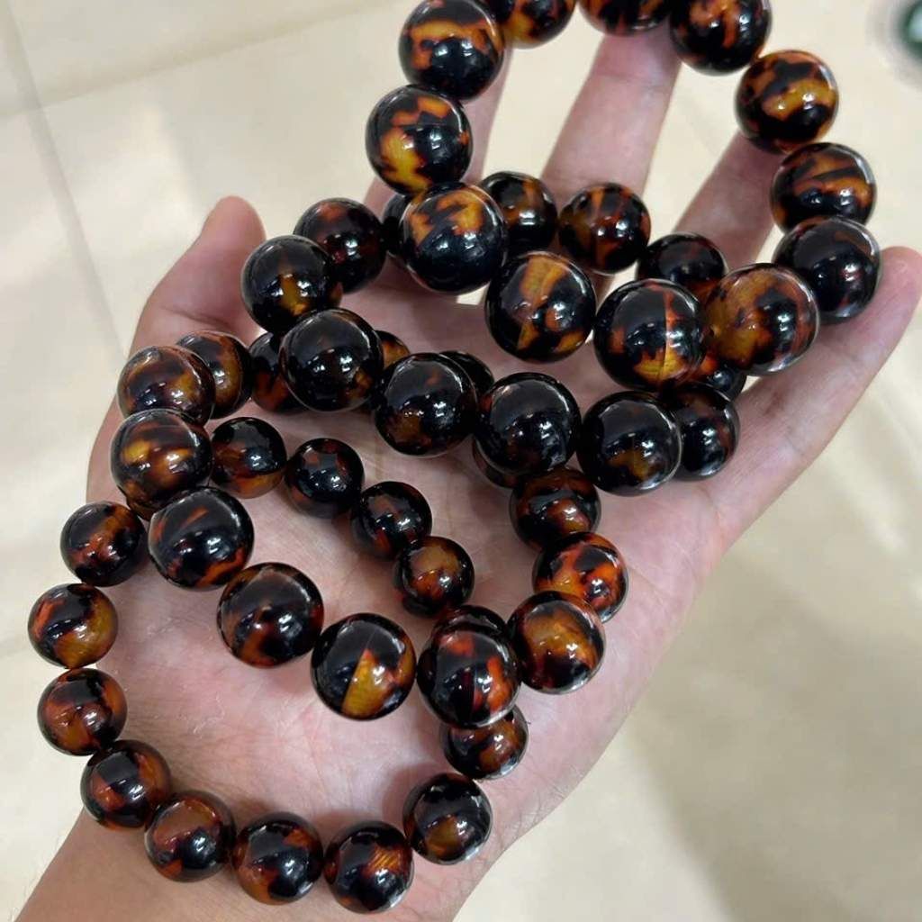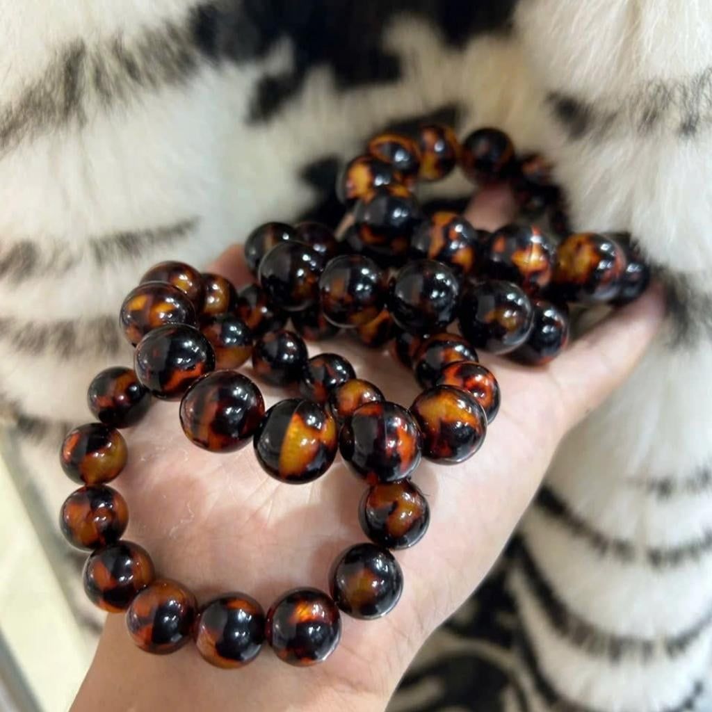 Chiếc vòng được kết từ những viên đồi mồi tròn trịa, bề mặt mịn và có độ bóng cao. Điểm đặc biệt nằm ở hoa văn tự nhiên không hạt nào giống hạt nào – những mảng màu đậm nhạt đan xen tạo chiều sâu thị giác, trông như những vệt ánh lửa ẩn bên trong khối vật liệu.