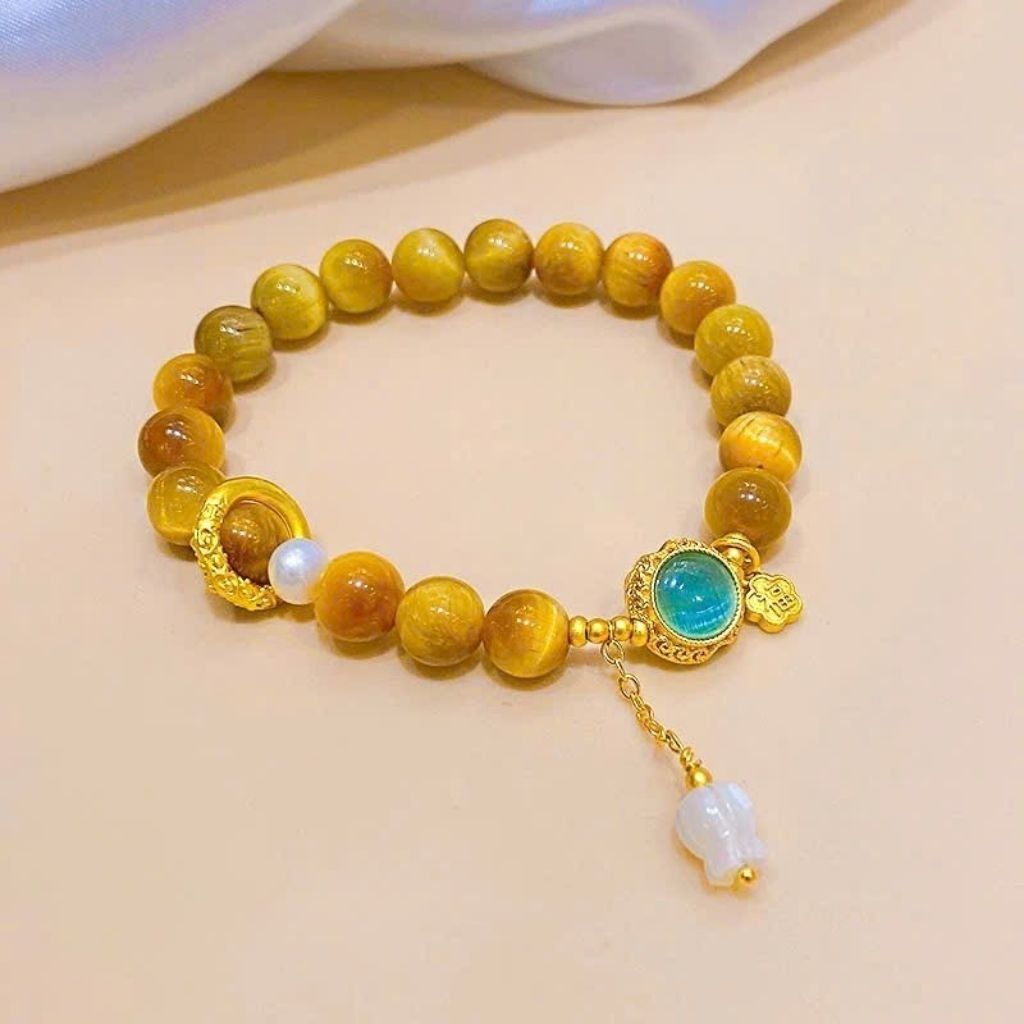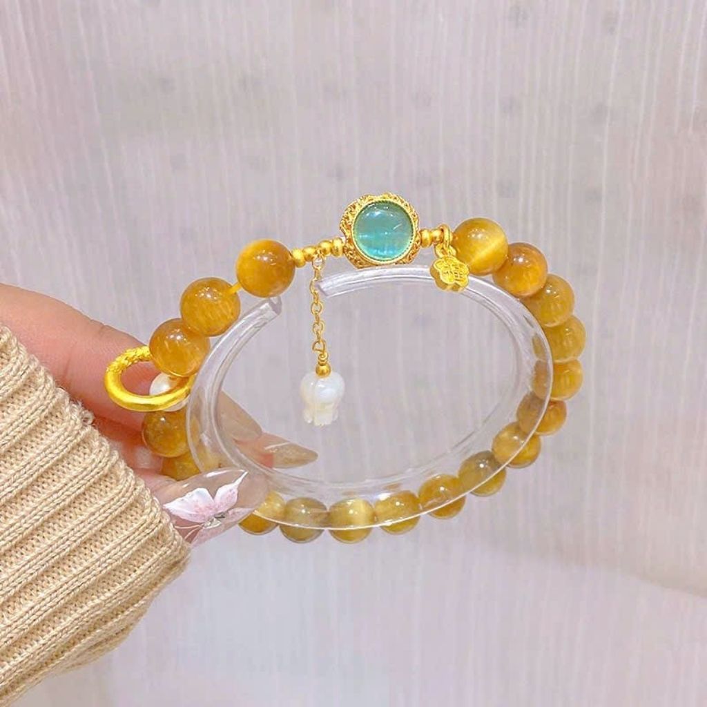 Vòng tay mang vẻ đẹp ấm áp, sang trọng và dễ phối đồ. Đá mắt hổ với hiệu ứng ánh sáng “mắt mèo” nổi bật, kết hợp hai viên ngọc đối màu tạo điểm nhấn độc đáo và đầy ý nghĩa phong thủy.