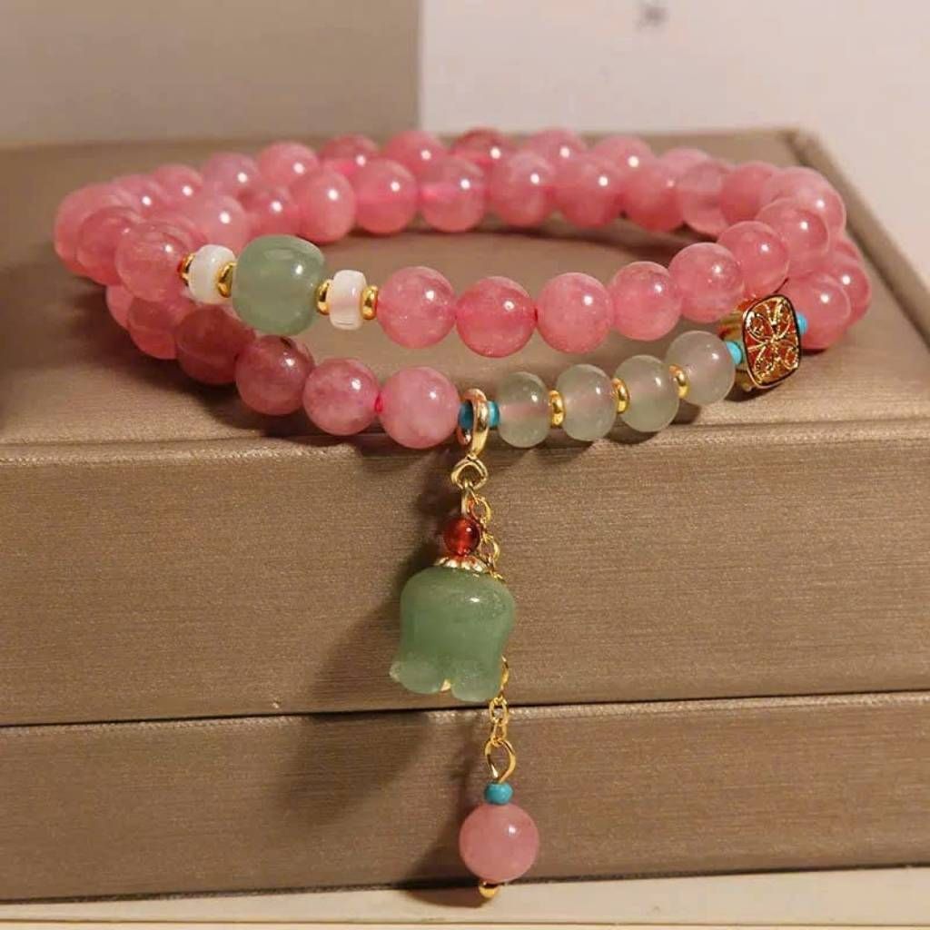 Hồng Ngọc Văn (đá chủ đạo): sắc hồng đậm ngọt ngào, bóng nhẹ, độ tròn đều tạo cảm giác nữ tính và mềm mại.