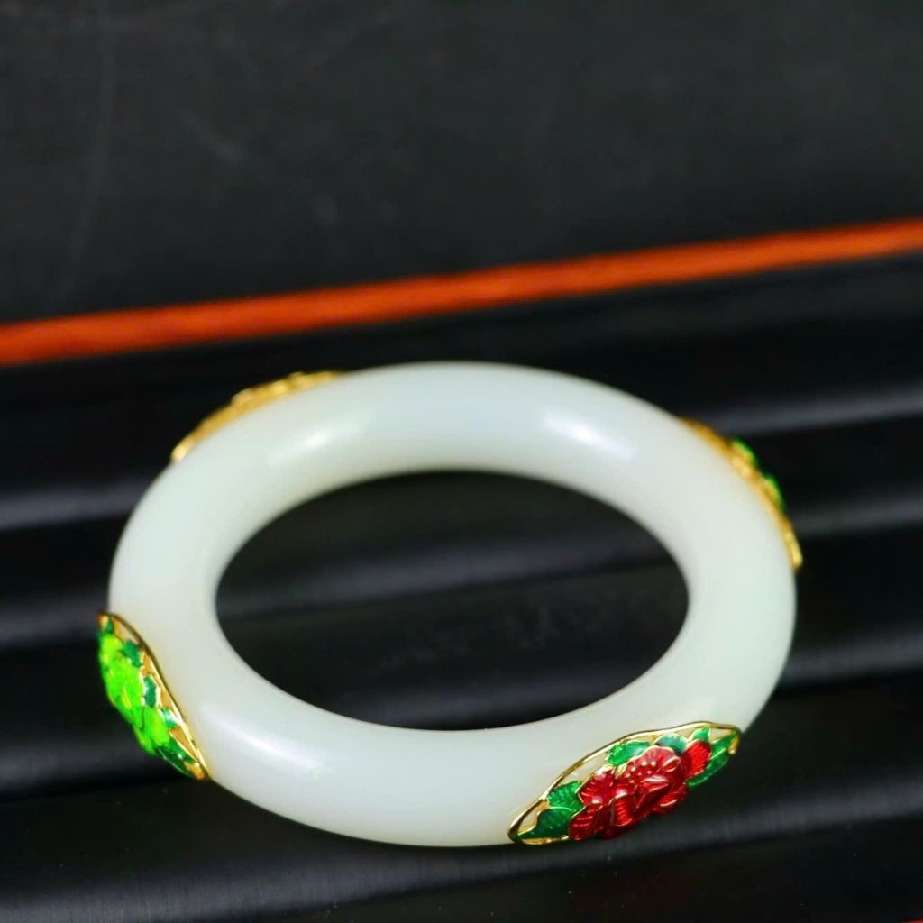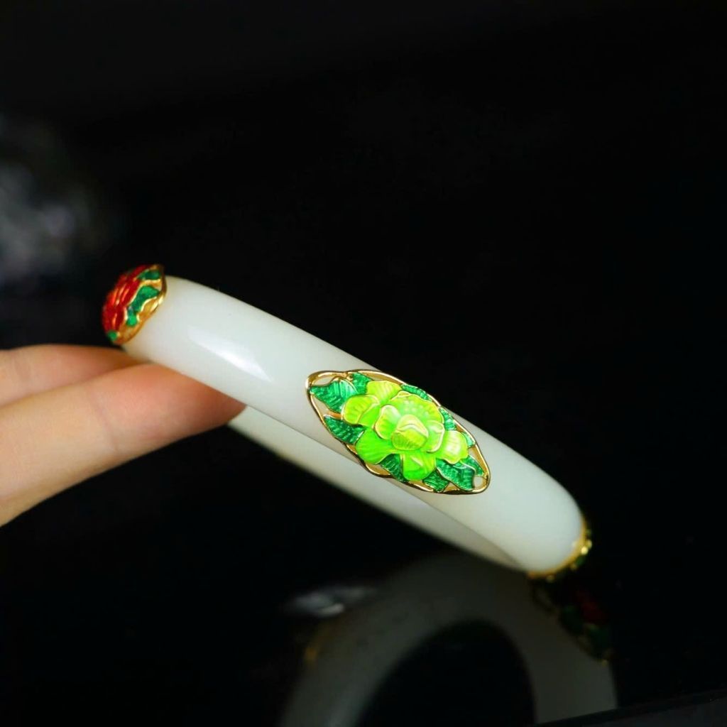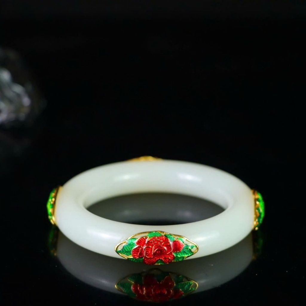 Chiếc vòng được chế tác tỉ mỉ với kỹ thuật men pháp lam truyền thống, tạo nên họa tiết hoa hồng đỏ nổi bật trên nền ngọc trắng tinh khôi. Sự kết hợp hài hòa giữa sắc vàng – trắng – đỏ – xanh mang lại vẻ đẹp rực rỡ, cuốn hút và đậm chất nghệ thuật.